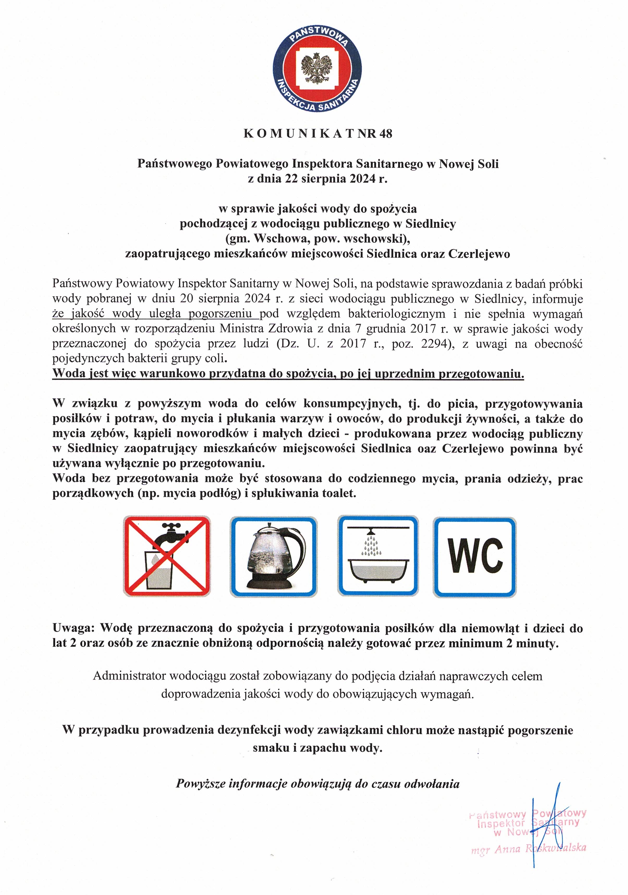 Państwowy Powiatowy Inspektor Sanitarny w Nowej Soli, na podstawie sprawozdania z badań próbki wody pobranej w dniu 20 sierpnia 2024 r. z sieci wodociągu publicznego w Siedlnicy, informuje że jakość wody uległa pogorszeniu pod względem bakteriologicznym i nie spełnia wymagań określonych w rozporządzeniu Ministra Zdrowia z dnia 7 grudnia 2017 r. w sprawie jakości wody przeznaczonej do spożycia przez ludzi (Dz. U. z 2017 r., poz. 2294), z uwagi na obecność pojedynczych bakterii grupy coli.