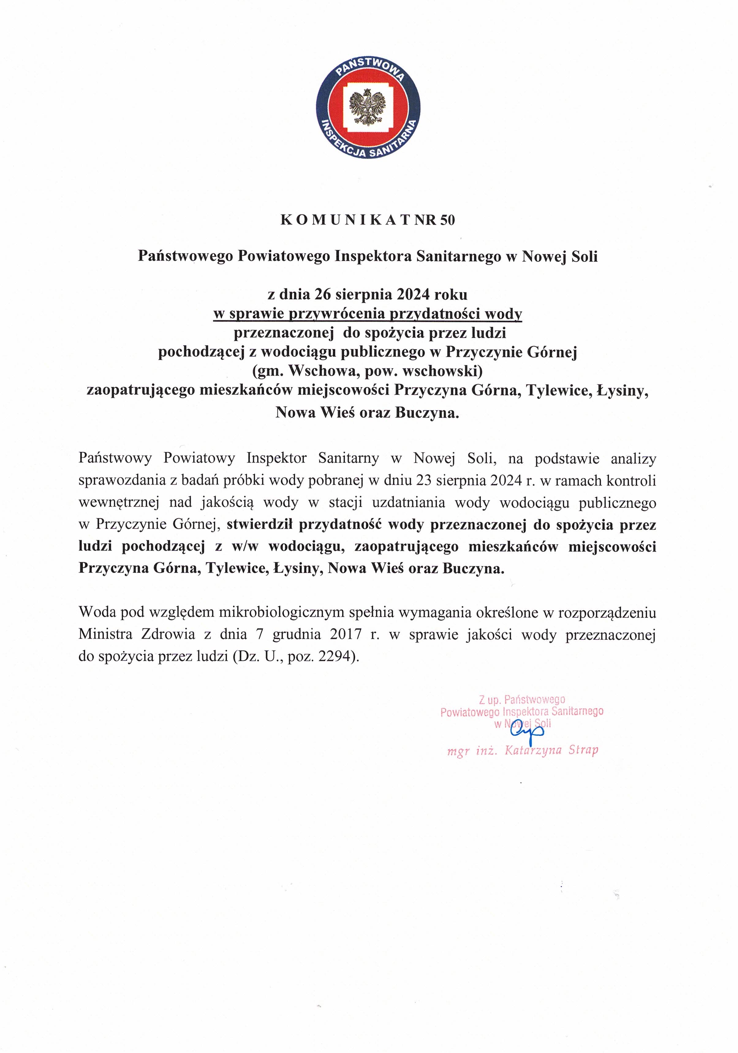 Państwowego Powiatowego Inspektora Sanitarnego w Nowej Soli z dnia 26 sierpnia 2024 roku w sprawie przywrócenia przydatności wody przeznaczonej do spożycia przez ludzi pochodzącej z wodociągu publicznego w Przyczynie Górnej (gm. Wschowa, pow. wschowski) zaopatrującego mieszkańców miejscowości Przyczyna Górna, Tylewice, Łysiny, Nowa Wieś oraz Buczyna.