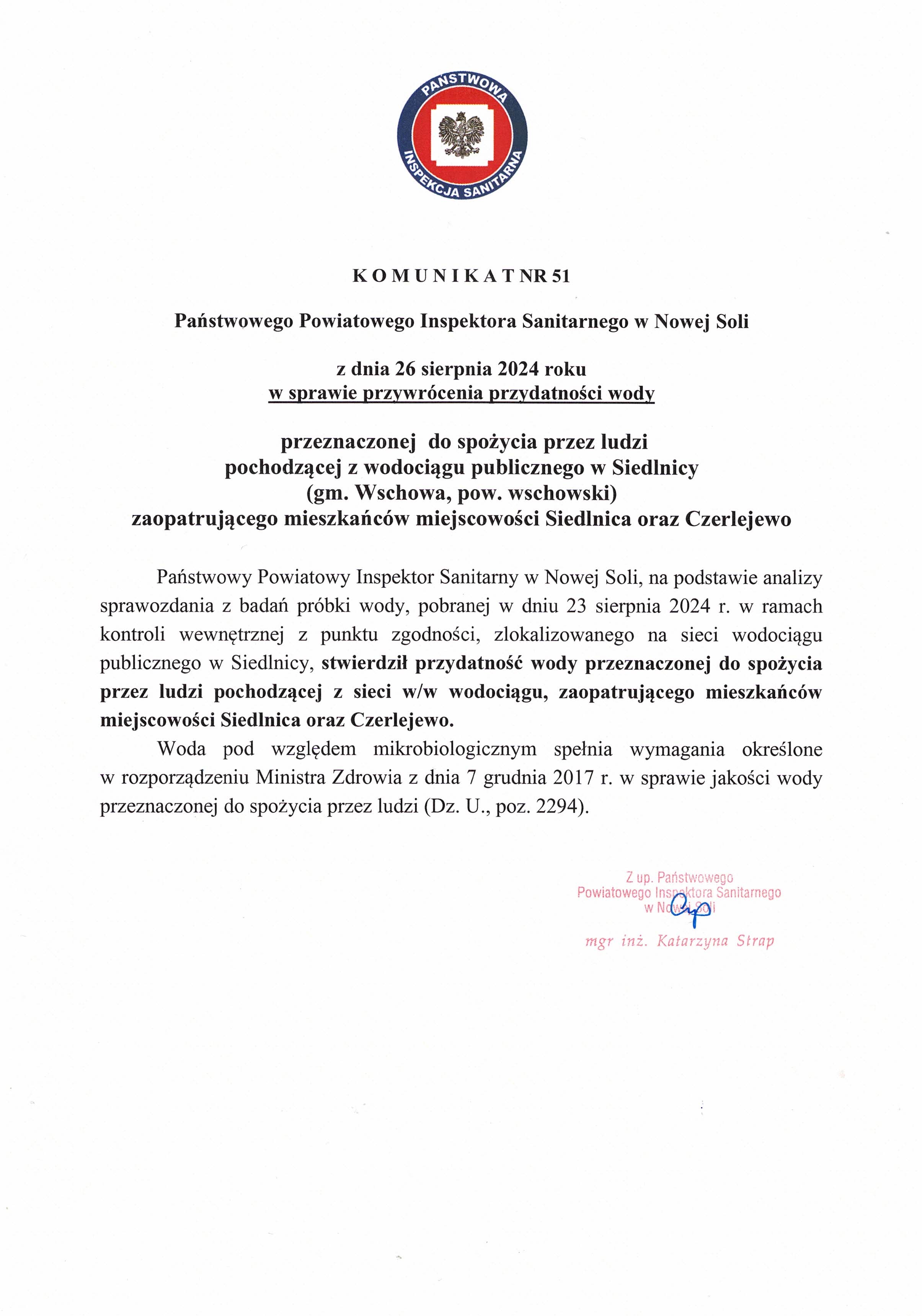 Państwowego Powiatowego Inspektora Sanitarnego w Nowej Soli z dnia 26 sierpnia 2024 roku w sprawie przywrócenia przydatności wody przeznaczonej do spożycia przez ludzi pochodzącej z wodociągu publicznego w Siedlnicy (gm. Wschowa, pow. wschowski) zaopatrującego mieszkańców miejscowości Siedlnica oraz Czerlejewo.