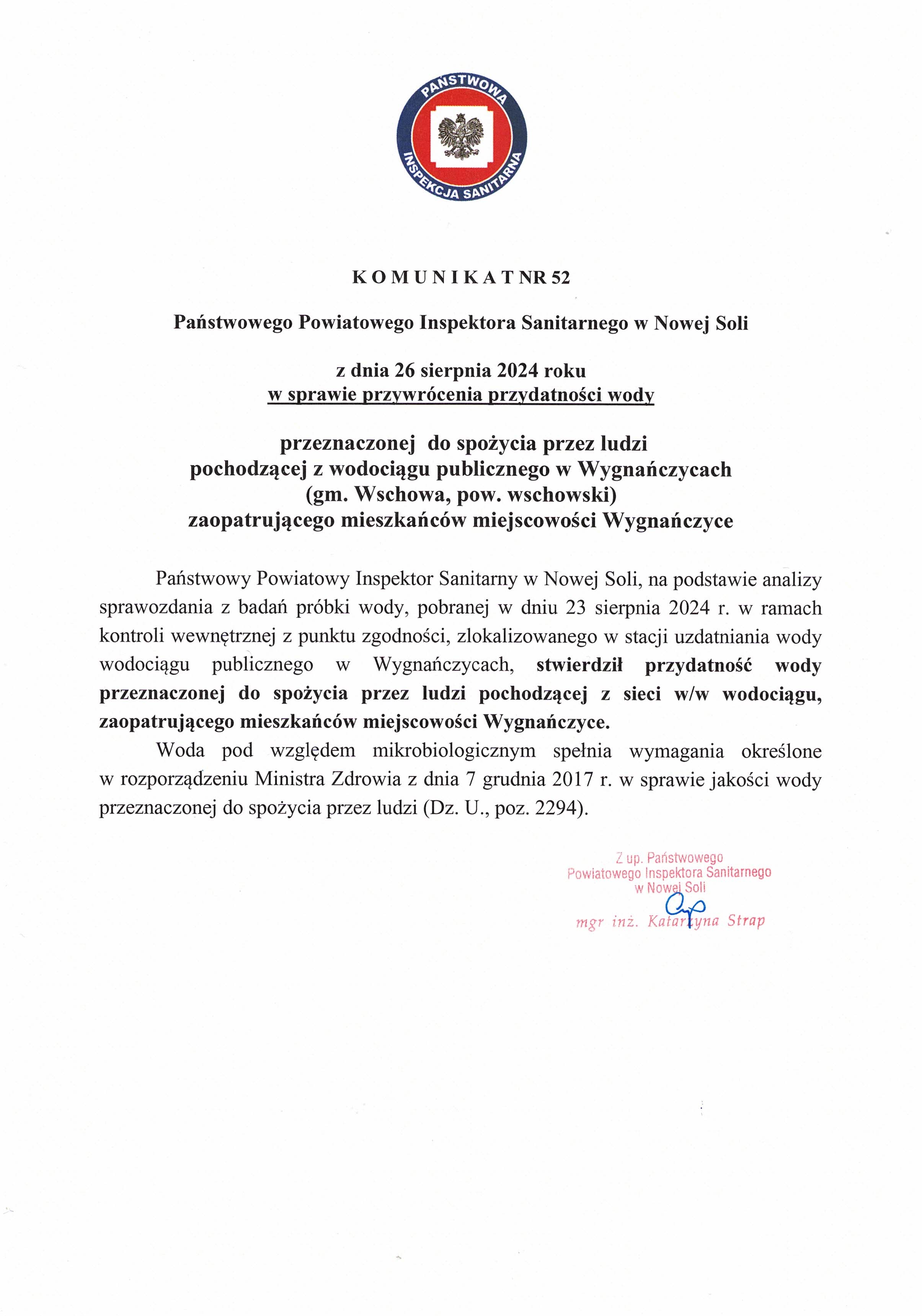 Państwowego Powiatowego Inspektora Sanitarnego w Nowej Soli z dnia 26 sierpnia 2024 roku w sprawie przywrócenia przydatności wody przeznaczonej do spożycia przez ludzi pochodzącej z wodociągu publicznego w Wygnańczycach (gm. Wschowa, pow. wschowski) zaopatrującego mieszkańców miejscowości Wygnańczyce.