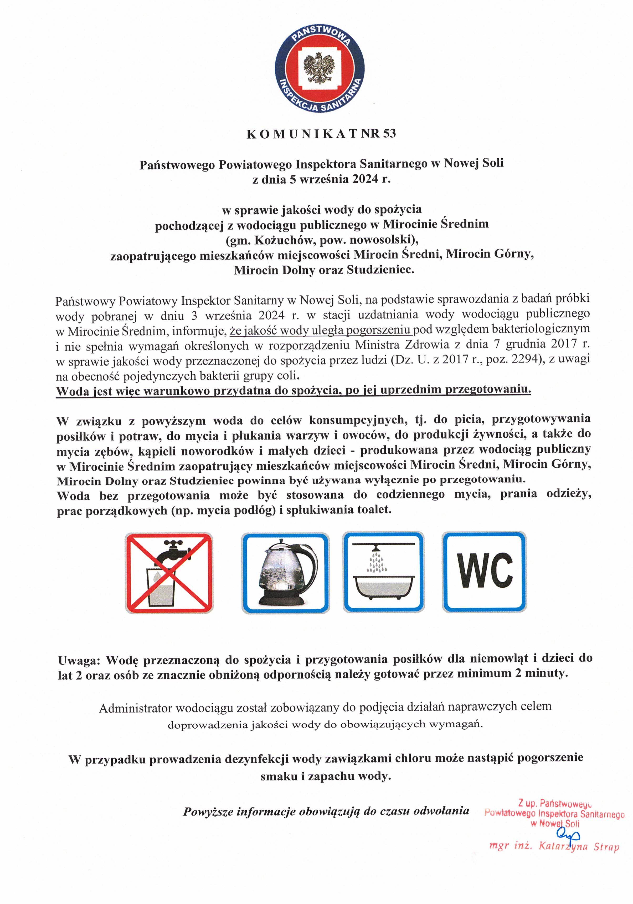 Państwowego Powiatowego Inspektora Sanitarnego w Nowej Soli z dnia 5 września 2024 r. w sprawie jakości wody do spożycia pochodzącej z wodociągu publicznego w Mirocinie Średnim (gm. Kożuchów, pow. nowosolski), zaopatrującego mieszkańców miejscowości Mirocin Średni, Mirocin Górny, Mirocin Dolny oraz Studzieniec.