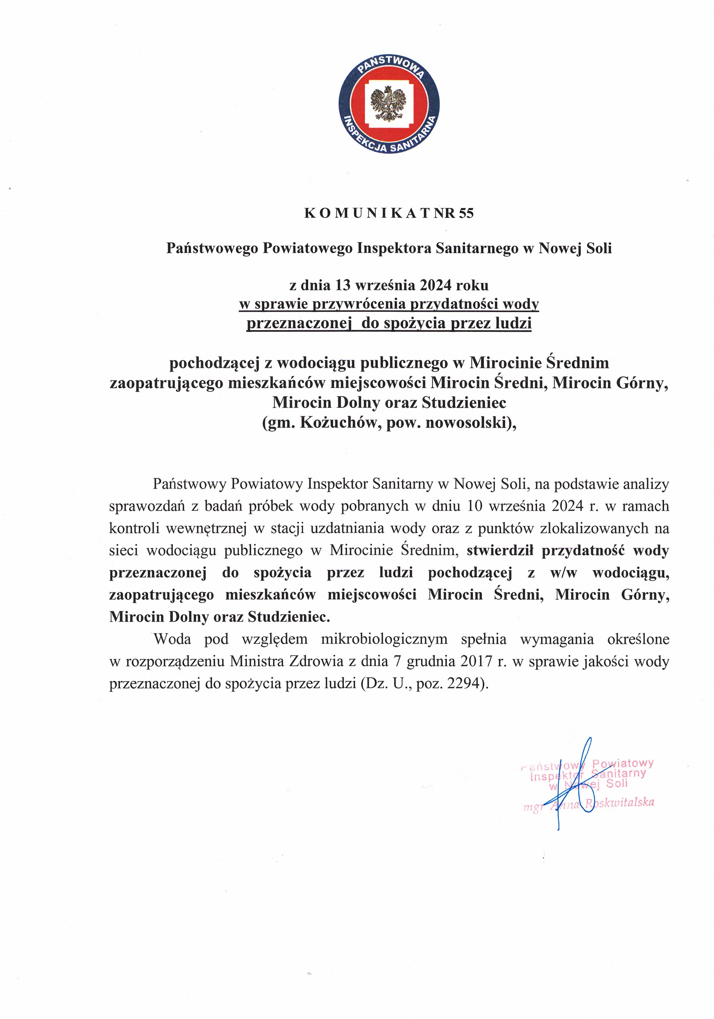 Państwowego Powiatowego Inspektora Sanitarnego w Nowej Soli z dnia 13 września 2024 roku w sprawie przywrócenia przydatności wody przeznaczonej do spożycia przez ludzi pochodzącej z wodociągu publicznego w Mirocinie Średnim zaopatrującego mieszkańców miejscowości Mirocin Średni, Mirocin Górny, Mirocin Dolny oraz Studzieniec (gm. Kożuchów, pow. nowosolski).