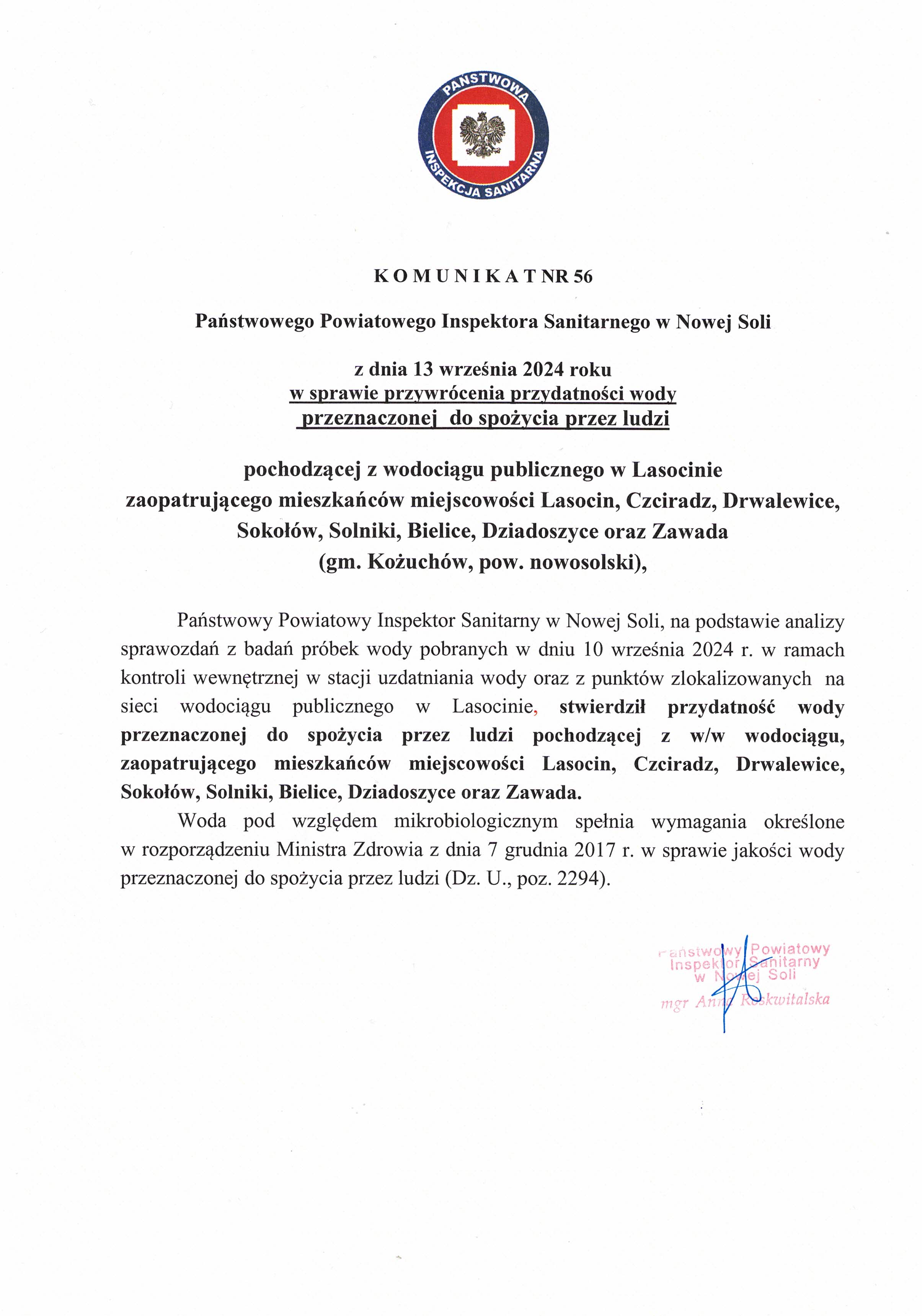 Państwowego Powiatowego Inspektora Sanitarnego w Nowej Soli z dnia 13 września 2024 roku w sprawie przywrócenia przydatności wody przeznaczonej do spożycia przez ludzi pochodzącej z wodociągu publicznego w Lasocinie zaopatrującego mieszkańców miejscowości Lasocin, Czciradz, Drwalewice, Sokołów, Solniki, Bielice, Dziadoszyce oraz Zawada (gm. Kożuchów, pow. nowosolski).