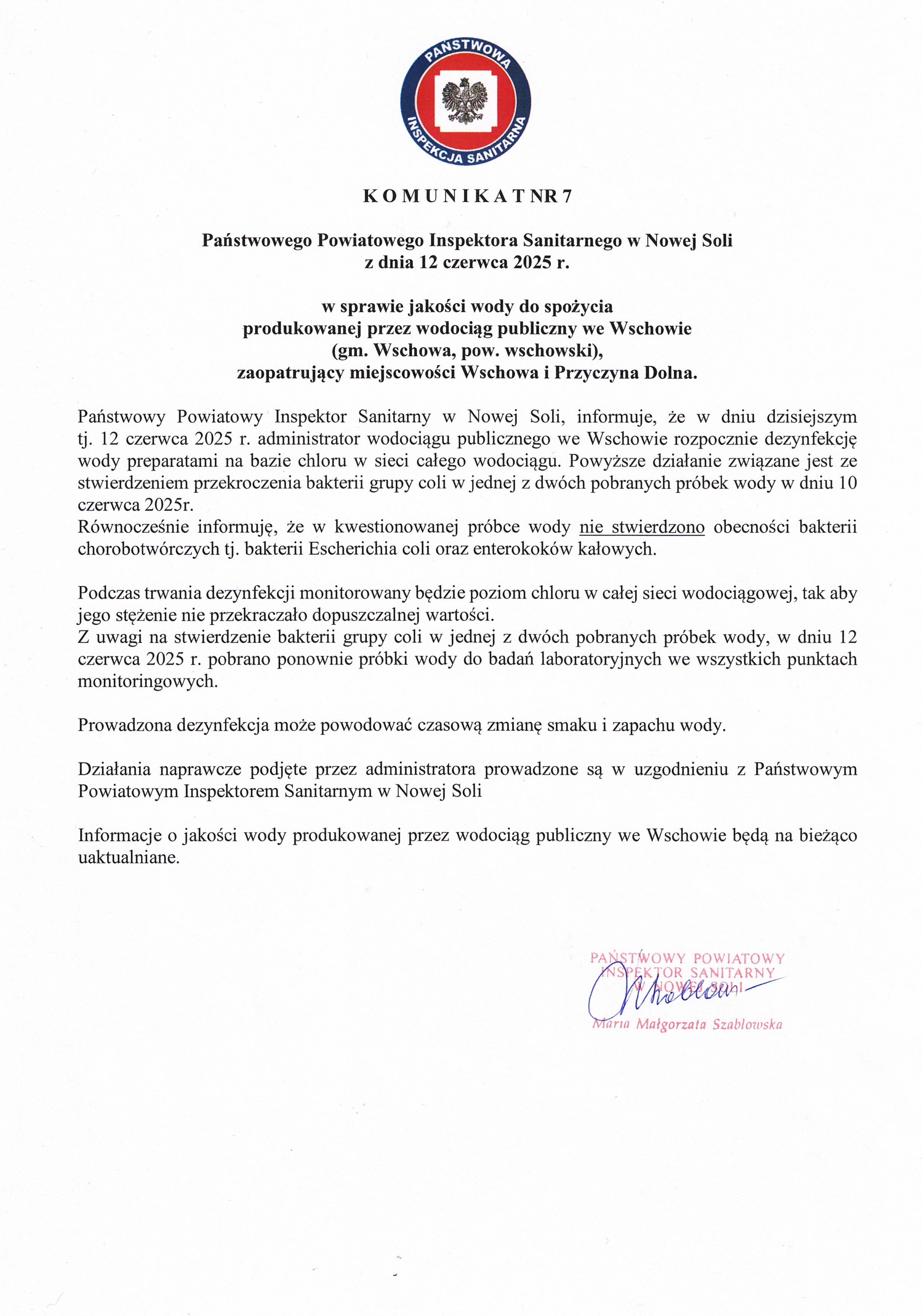 Państwowy Powiatowy Inspektor Sanitarny w Nowej Soli, informuje, że w dniu dzisiejszym tj. 12 czerwca 2025 r. administrator wodociągu publicznego we Wschowie rozpocznie dezynfekcję wody preparatami na bazie chloru w sieci całego wodociągu. Powyższe działanie związane jest ze stwierdzeniem przekroczenia bakterii grupy coli w jednej z dwóch pobranych próbek wody w dniu 10 czerwca 2025r.