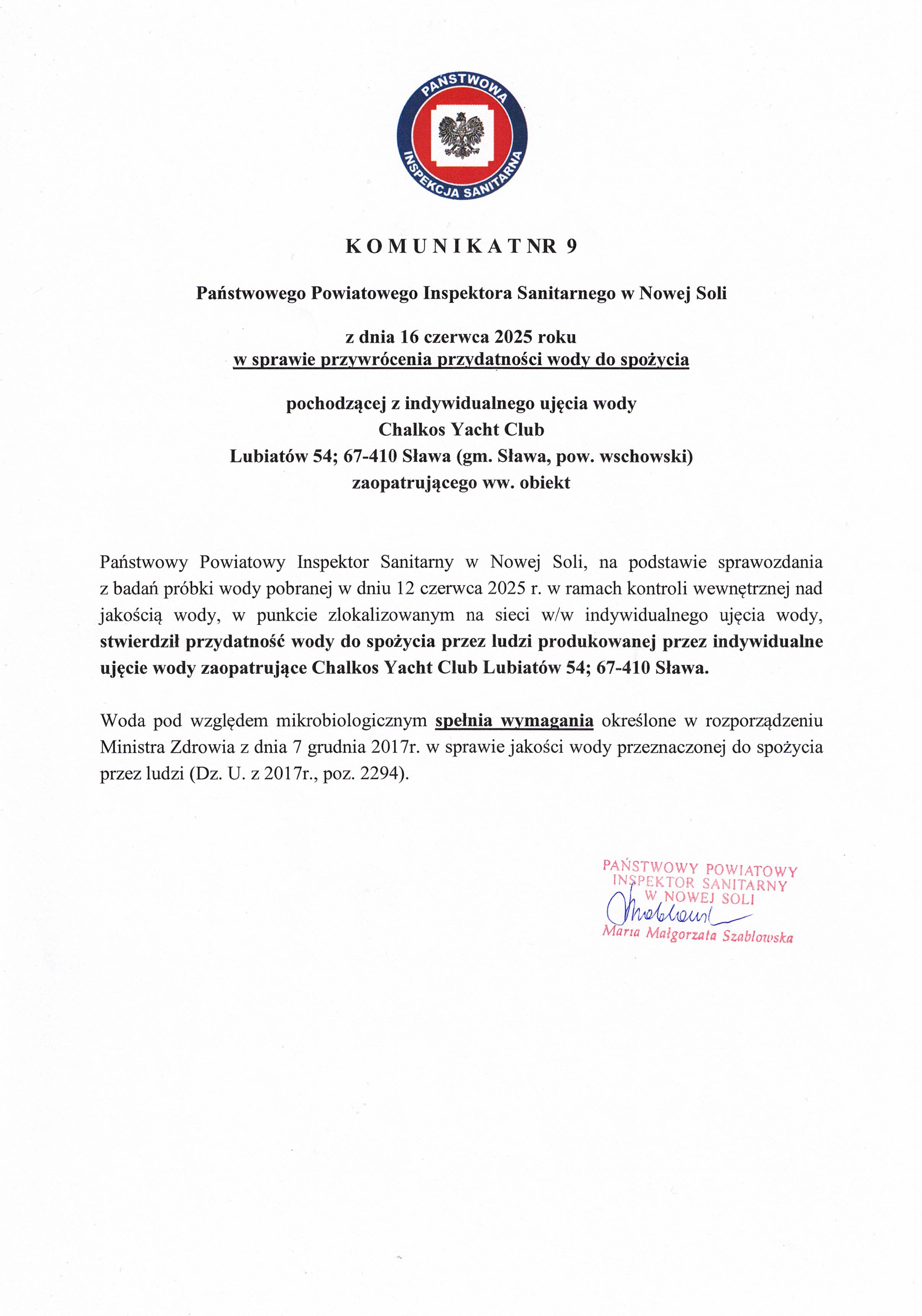 Państwowego Powiatowego Inspektora Sanitarnego w Nowej Soli z dnia 16 czerwca 2025 roku w sprawie przywrócenia przydatności wody do spożycia pochodzącej z indywidualnego ujęcia wody Chalkos Yacht Club Lubiatów 54; 67-410 Sława (gm. Sława, pow. wschowski) zaopatrującego ww. obiekt