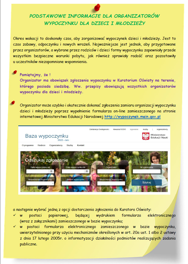Wkrótce rozpoczną się wakacje w związku z powyższym zachęcamy organizatorów oraz rodziców/opiekunów prawnych do zapoznania się z przygotowanymi wskazówkami dotyczącymi organizacji wypoczynku dla dzieci i młodzieży.