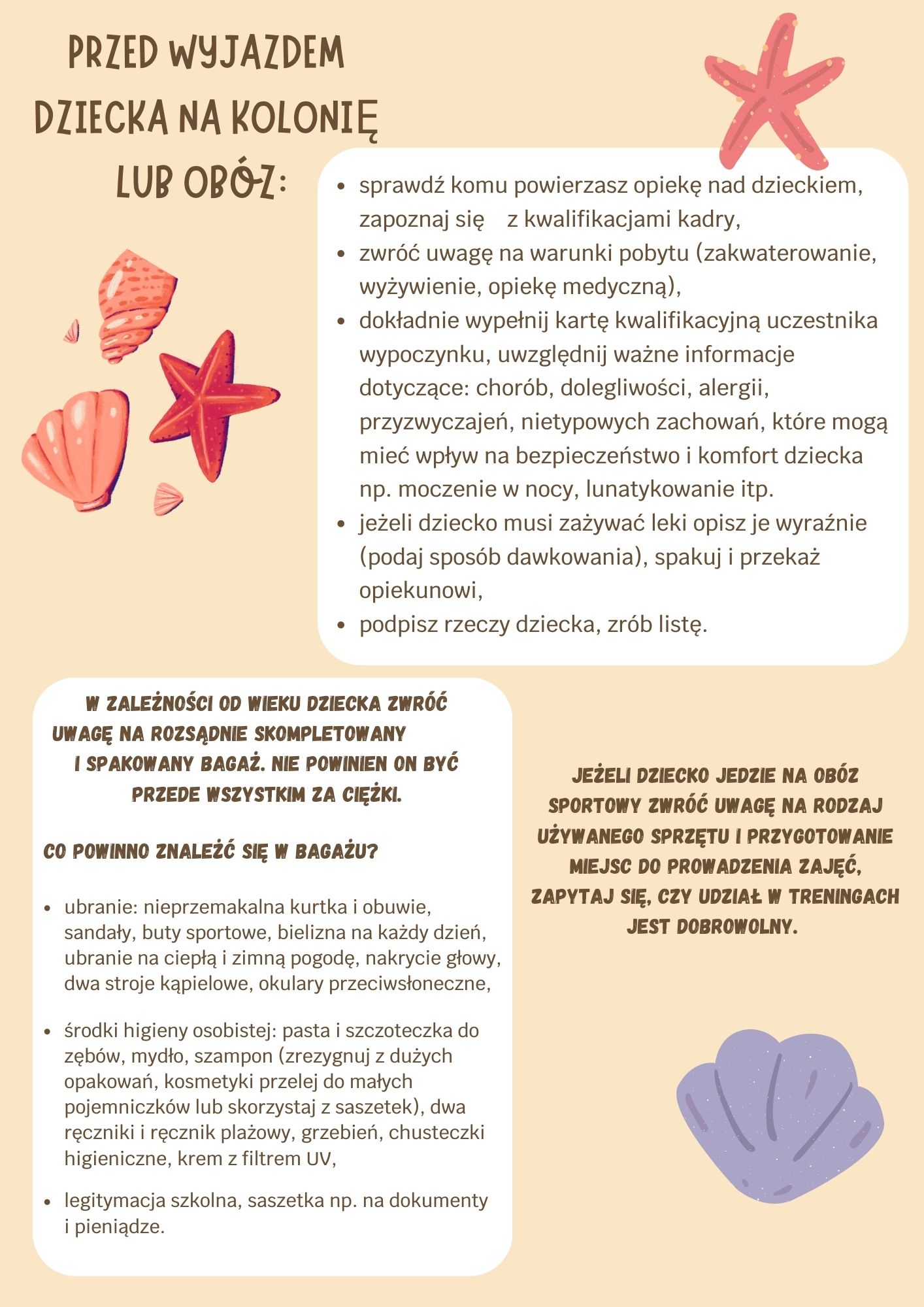 Przedstawiamy również kilka porad o czym należy pamiętać wybierając dla swoich pociech formę letniego wypoczynku. Przede wszystkim pamiętajmy, iż w sprawdzeniu wiarygodności organizatora pomoże publiczna baza danych o wypoczynku Ministerstwa Edukacji i Nauki, za pomocą której każdy rodzic może przekonać się, czy dany organizator zgłosił turnus do właściwego Kuratorium Oświaty.