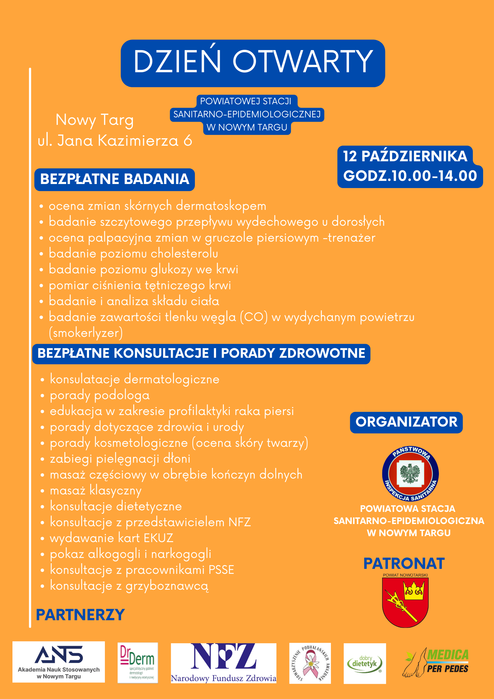 12 października 2023 r. (czwartek) w godzinach 10:00-14:00 zapraszamy na DZIEŃ OTWARTY Powiatowej Stacji Sanitarno-Epidemiologicznej w Nowym Targu, podczas którego mieszkańcy powiatu nowotarskiego będą mogli zapoznać się z działalnością Państwowej Inspekcji Sanitarnej oraz skorzystać z oferty Partnerów wspierających nas w organizacji tego wydarzenia (Akademia Nauk Stosowanych w Nowym Targu, Narodowy Fundusz Zdrowia Delegatura w Nowym Targu, Medica per Pedes, DrDerm, Poradnia DOBRY DIETETYK oraz Stowarzyszenie Podhalańskich Amazonek). Patronat nad wydarzeniem objął Starosta Nowotarski.