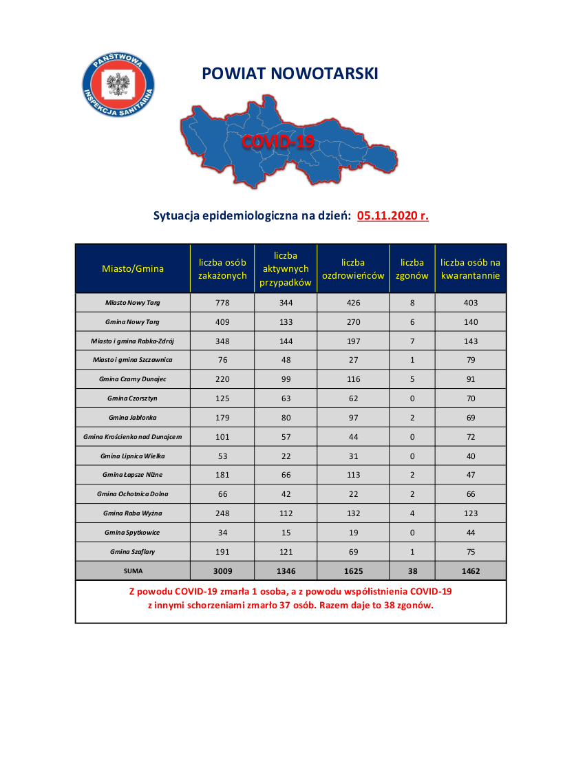 COVID-19 Sytuacja epidemiologiczna na dzień 05.11.2020 r. w powiecie nowotarskim