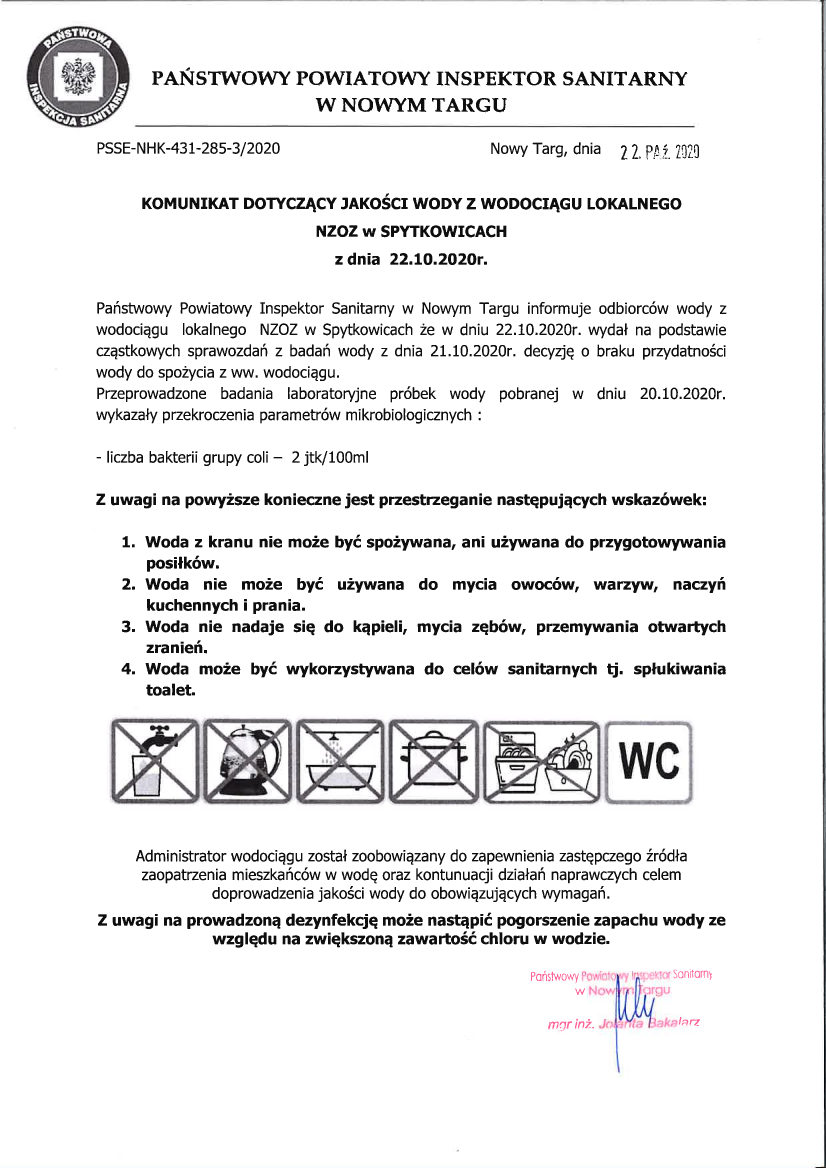 Komunikat dot. jakości wody z wodociągu lokalnego NZOZ w Spytkowicach z dnia 22.10.2020 r. Treść komunikatu: