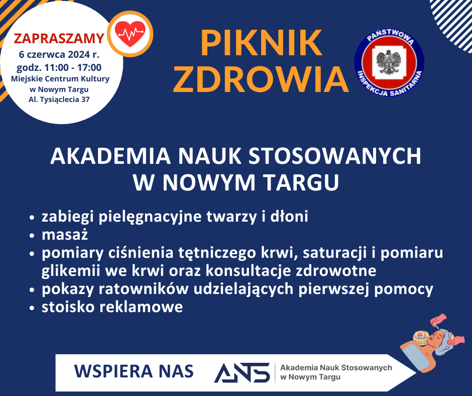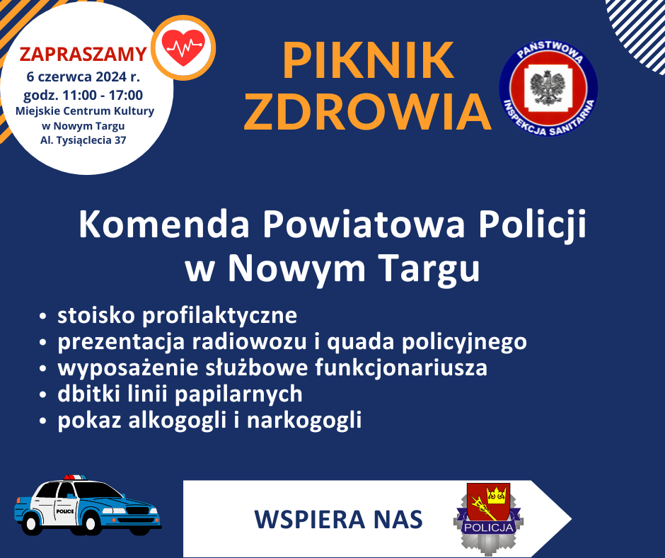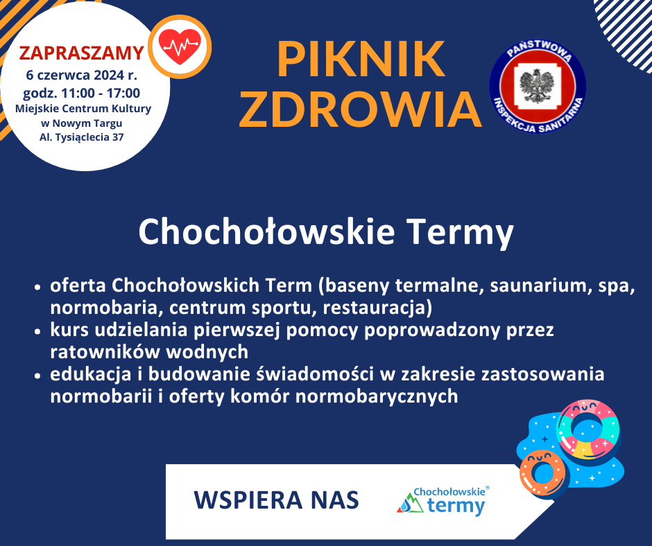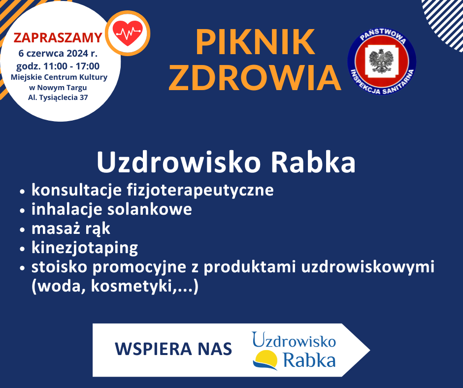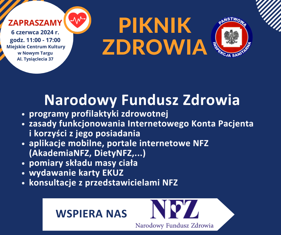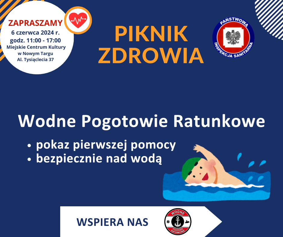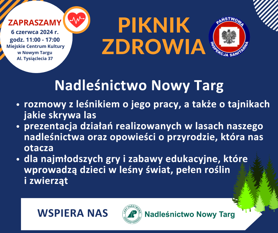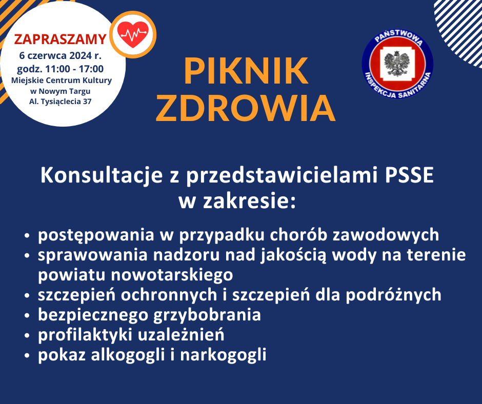 Państwowy Powiatowy Inspektor Sanitarny w Nowym Targu wraz ze współorganizatorami: Starostwem Powiatowym w Nowym Targu, Urzędem Miasta Nowy Targ oraz Miejskim Centrum Kultury w Nowym Targu, zapraszają na Piknik Zdrowia, który odbędzie się 6 czerwca 2024 r. w godz. od 11.00 do 17.00, na terenie i w pobliżu Miejskiego Centrum Kultury w Nowym Targu.