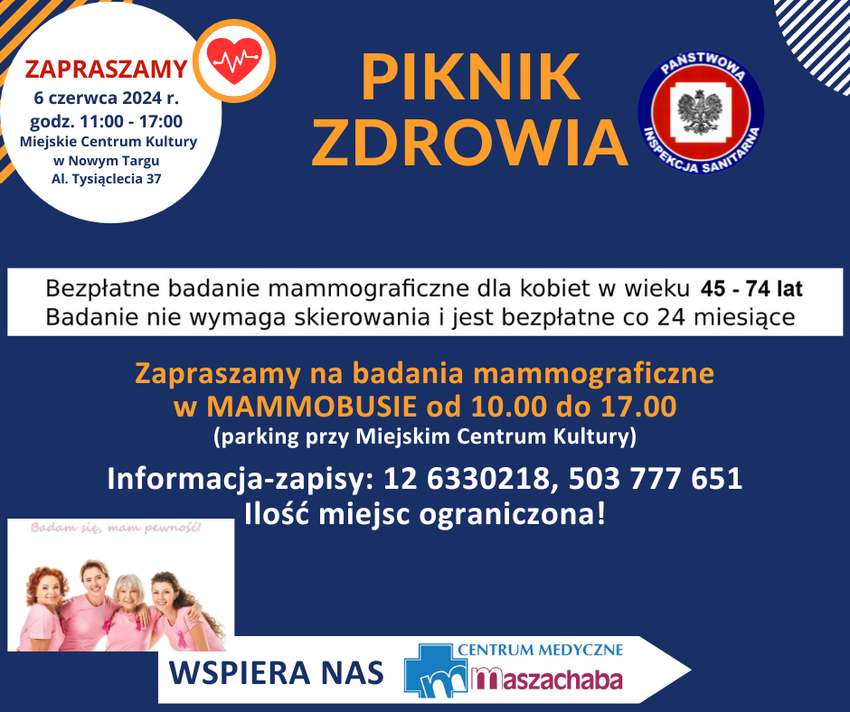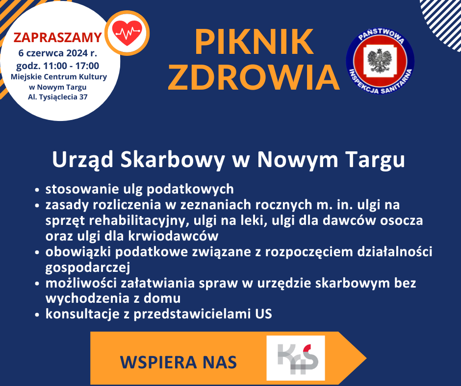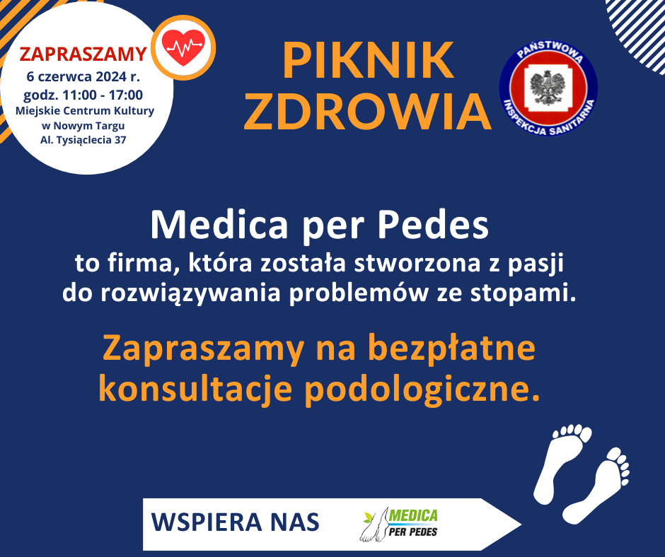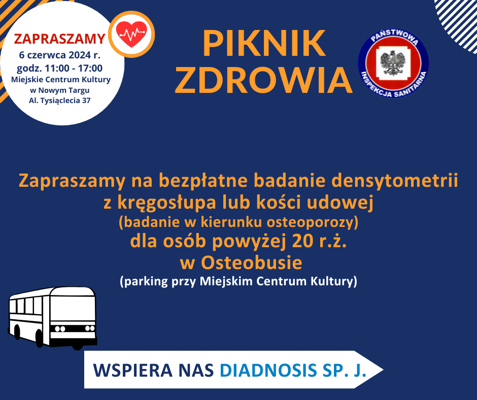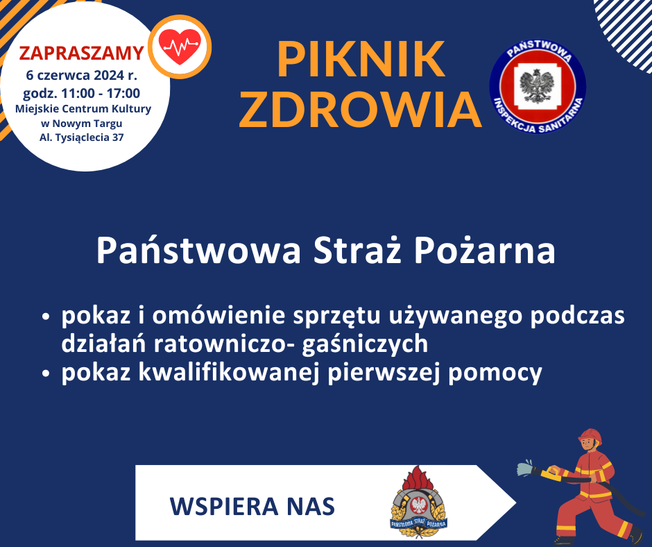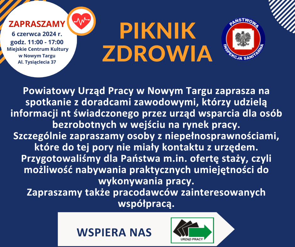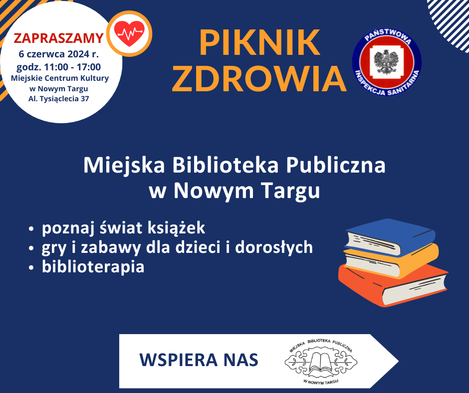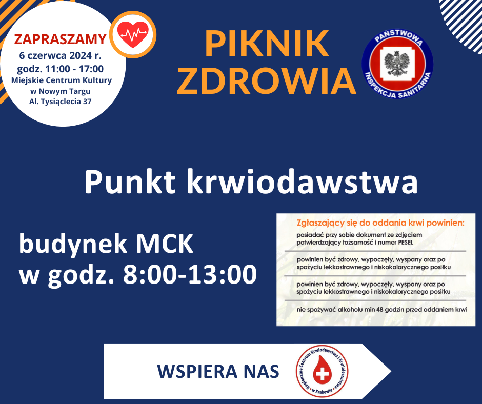Państwowy Powiatowy Inspektor Sanitarny w Nowym Targu wraz ze współorganizatorami: Starostwem Powiatowym w Nowym Targu, Urzędem Miasta Nowy Targ oraz Miejskim Centrum Kultury w Nowym Targu, zapraszają na Piknik Zdrowia, który odbędzie się 6 czerwca 2024 r. w godz. od 11.00 do 17.00, na terenie i w pobliżu Miejskiego Centrum Kultury w Nowym Targu.