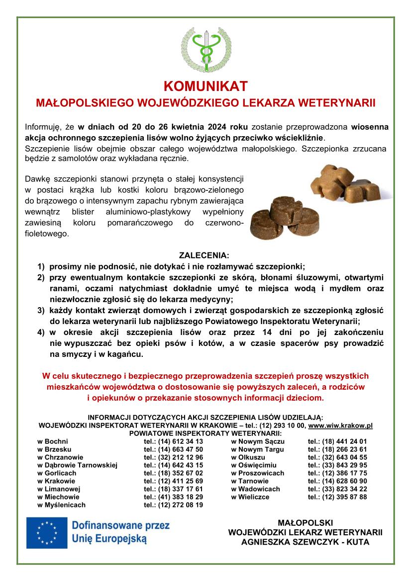 w dniach od 20 do 26 kwietnia 2024 roku zostanie przeprowadzona wiosenna akcja ochronnego szczepienia lisów wolno żyjących przeciwko wściekliźnie. Szczepienie lisów obejmie obszar całego województwa małopolskiego. Szczepionka zrzucana będzie z samolotów oraz wykładana ręcznie. Dawkę szczepionki stanowi pakiet w postaci krążka/prostopadłościanu koloru zielonobrązowego o intensywnym zapachu rybnym zawierający wewnątrz blister aluminiowo – plastykowy wypełniony płynem.