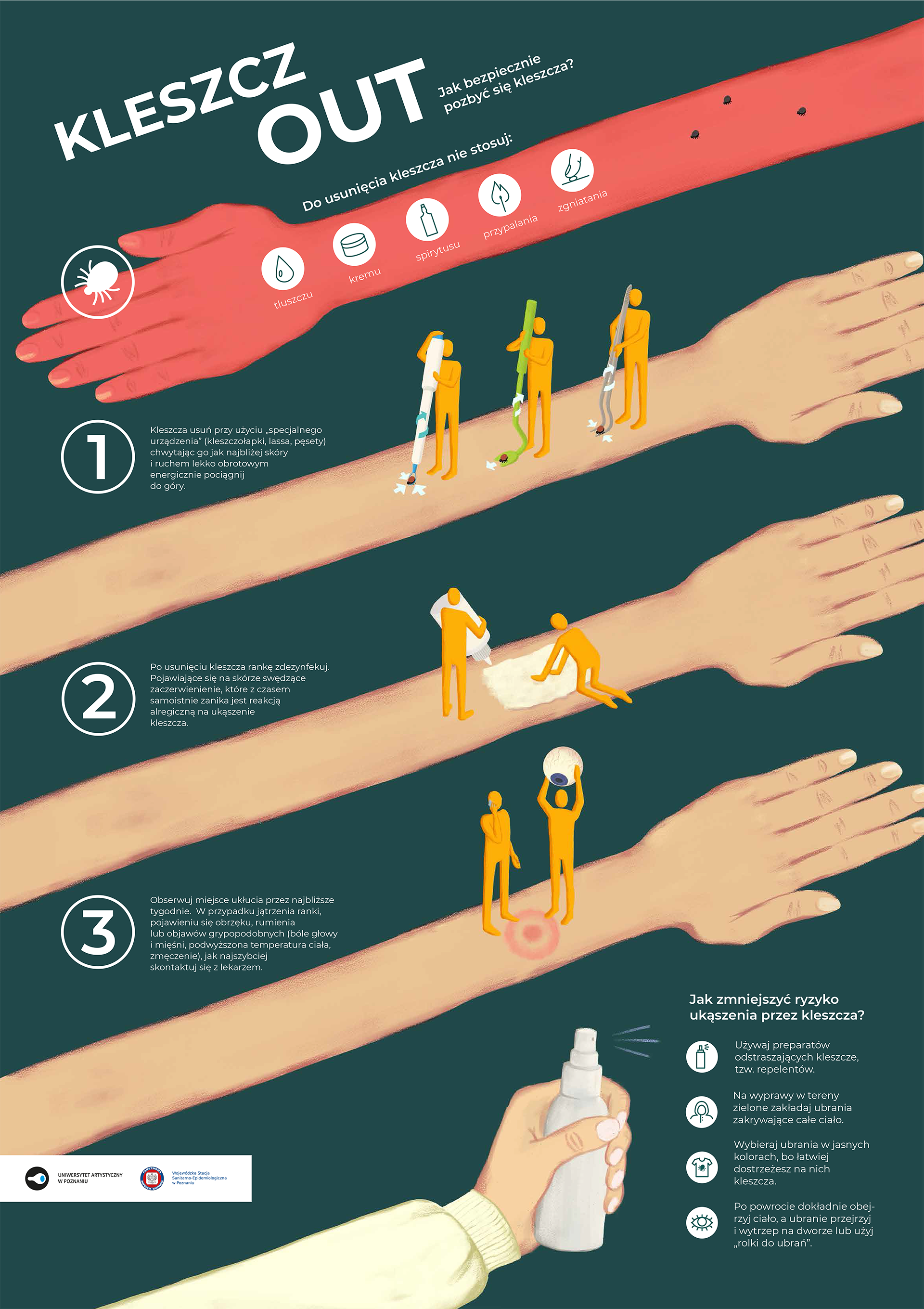 Celem projektu edukacyjnego „Mały kleszcz – duży problem?”, realizowanego na terenie woj. wielkopolskiego od 2018 roku, jest wzrost poziomu wiedzy społeczeństwa na temat kleszczy, związanych z nimi zagrożeń oraz profilaktyki chorób odkleszczowych. Dotychczas pracownicy Państwowej Inspekcji Sanitarnej z terenu woj. wielkopolskiego w ramach realizacji ww. projektu przeprowadzili liczne szkolenia i pogadanki skierowane głównie do harcerzy, seniorów, grzybiarzy, działkowców, kierowników i opiekunów dzieci i młodzieży w trakcie wypoczynku letniego oraz koordynatorów edukacji zdrowotnej czy pielęgniarek środowiska szkolnego. Wszelkie działanie edukacyjne połączone były z rozdawnictwem materiałów informacyjno-edukacyjnych na temat kleszczy oraz instruktażem prawidłowego i bezpiecznego ich usuwania.