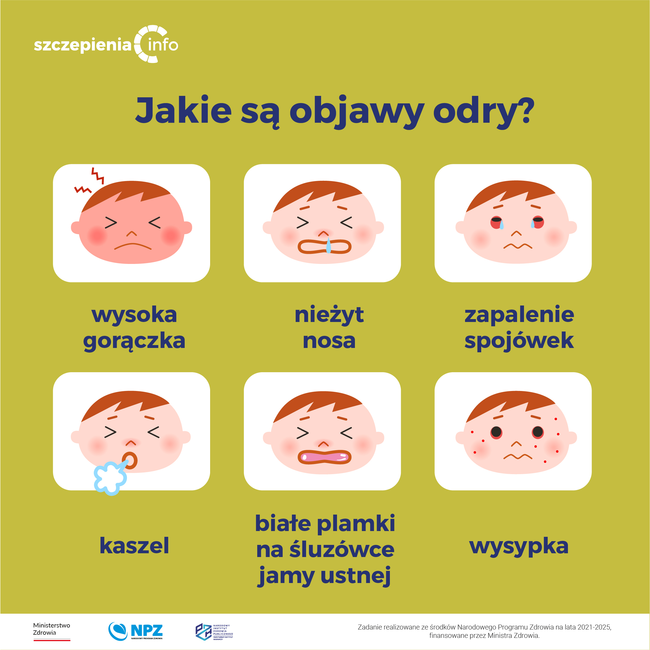 - Pierwsze objawy odry pojawiają się po 10-12 dniowym okresie inkubacji i charakteryzują się gorączką, zapaleniem spojówek, katarem, kaszlem i zapaleniem oskrzelików. U prawie wszystkich podatnych, zarażonych osób rozwija się postać kliniczna choroby.