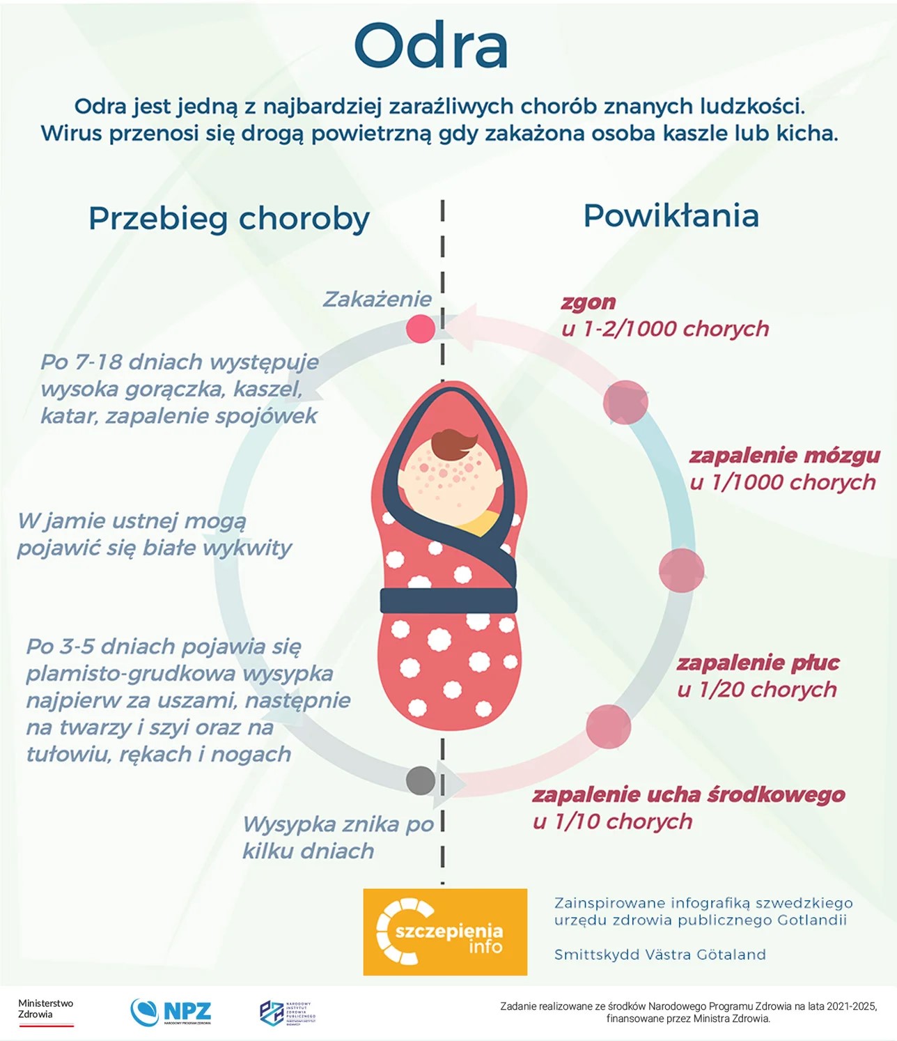 - Liczba przypadków śmiertelnych wynosi 1-3 na 1000 przypadków, a najwyższa jest u dzieci poniżej 5 r.ż. i u osób z obniżoną odpornością. Zapalenie płuc odpowiada za sześć z dziesięciu zgonów związanych z odrą.