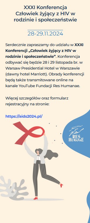 Krajowe Centrum ds. AIDS przyłącza się również do zaproszenia, wystosowanego przez Polską Fundację Pomocy Humanitarnej „Res Humanae”, do udziału w organizowanej z okazji Światowego Dnia AIDS XXXI Konferencji „Człowiek żyjący z HIV w rodzinie i społeczeństwie”. W tym roku Konferencja odbędzie się w dniach 28 - 29 listopada. Konferencja jest największym forum dyskusyjnym poświęconym zagadnieniom HIV i AIDS pod kątem medyczno-społecznym, organizowanym z okazji Światowego Dnia AIDS w naszym kraju.