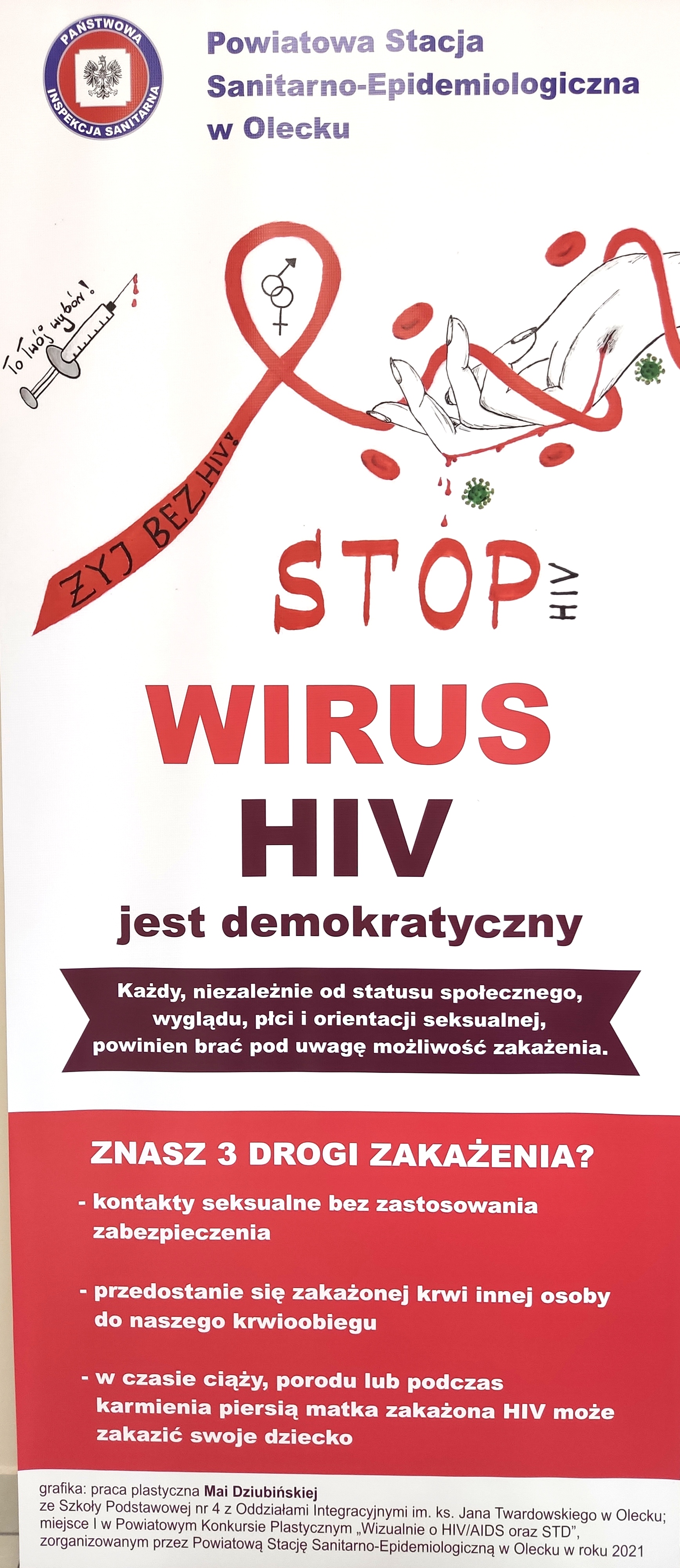 W ubiegłym roku zorganizowaliśmy i przeprowadziliśmy Powiatowy Konkurs Plastyczny „Wizualnie o HIV/AIDS oraz STD”. Wygrała go Maja Dziubińska z kl. 7 Szkoły Podstawowej nr 4 z Oddziałami Integracyjnymi im. ks. Jana Twardowskiego w Olecku. Jej praca tak bardzo nam się spodobała, że postanowiliśmy stworzyć roll-up z jej wizerunkiem. Z przyjemnością będziemy go wykorzystywać podczas naszych działań edukacyjnych i promocyjnych.