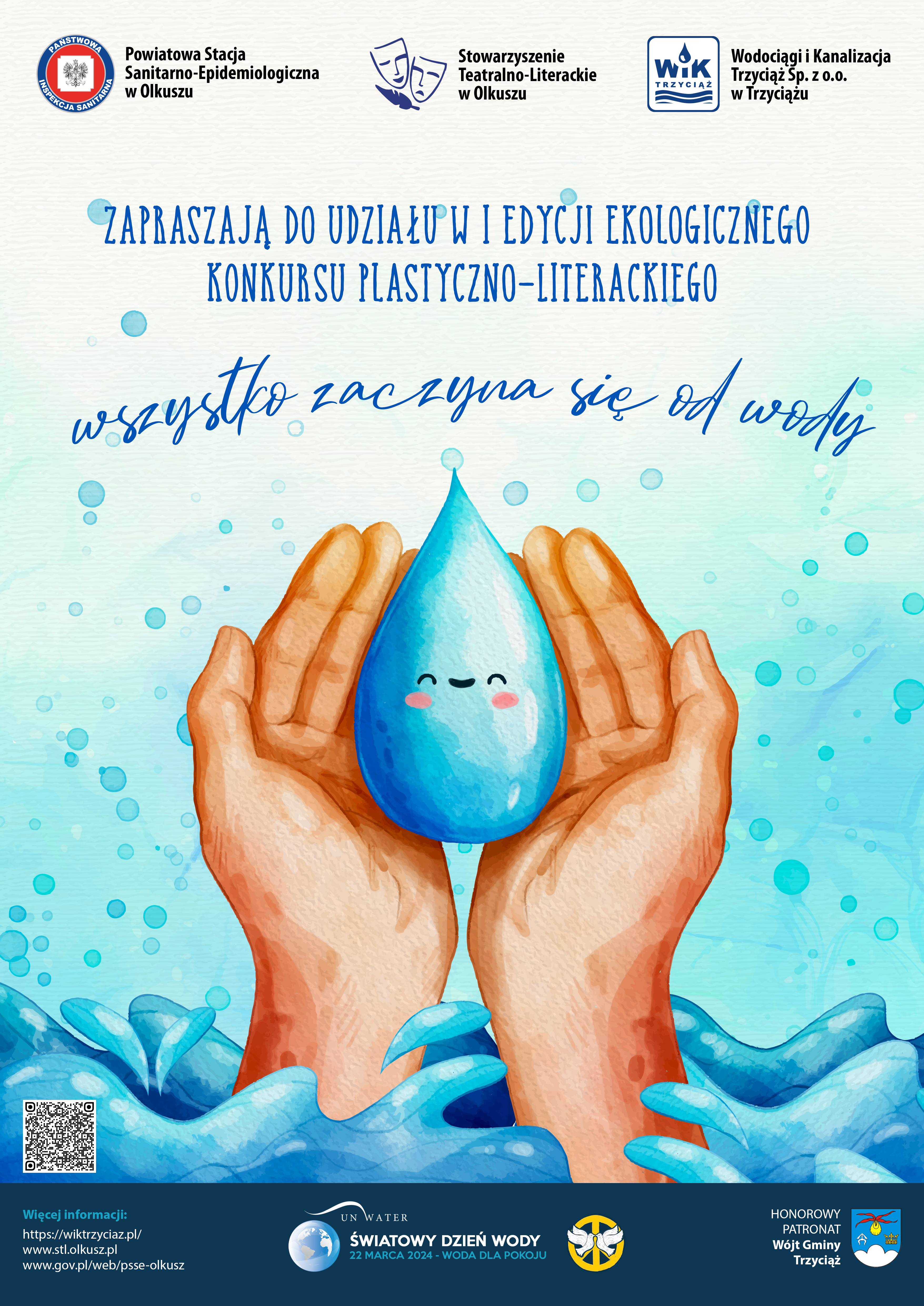 Powiatowa Stacja Sanitarno - Epidemiologiczna w Olkuszu, Wodociągi i Kanalizacja Trzyciąż Sp. z o.o. i Stowarzyszenie Teatralno-Literackie w Olkuszu zapraszają do udziału w I edycji ekologicznego konkursu plastyczno-literackiego „Wszystko zaczyna się od wody” pod patronatem honorowym Wójta Gminy Trzyciąż.