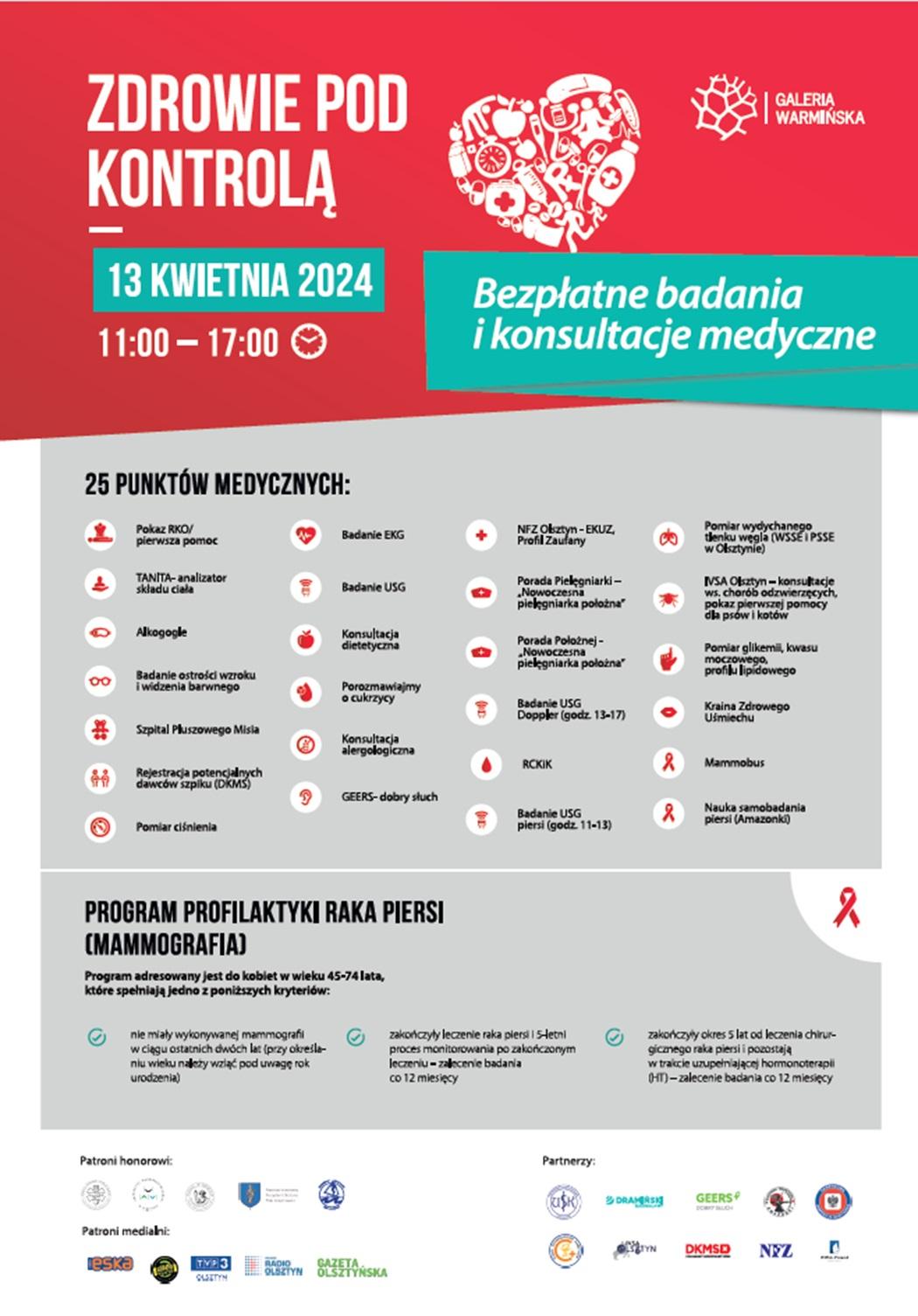 13 kwietnia 2024 r. w godzinach 11:00 - 17:00 warto wybrać się do Galerii Warmińskiej w Olsztynie, gdzie odbędzie się akcja profilaktyczna "Zdrowie pod kontrolą". Podczas akcji będzie można odwiedzić wiele stanowisk medycznych, w tym stoisko promocji zdrowia Powiatowej i Wojewódzkiej Stacji Sanitarno-Epidemiologicznej w Olsztynie.