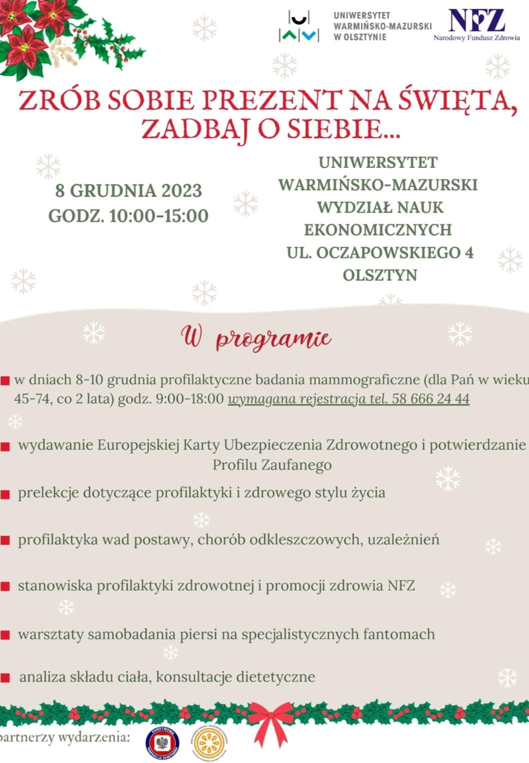 8 grudnia 2023 r. w godzinach 10.00-15.00 warto wybrać się na Uniwersytet Warmińsko-Mazurski w Olsztynie, gdzie odbędzie się akcja "Zrób sobie prezent na święta, zadbaj o siebie...".