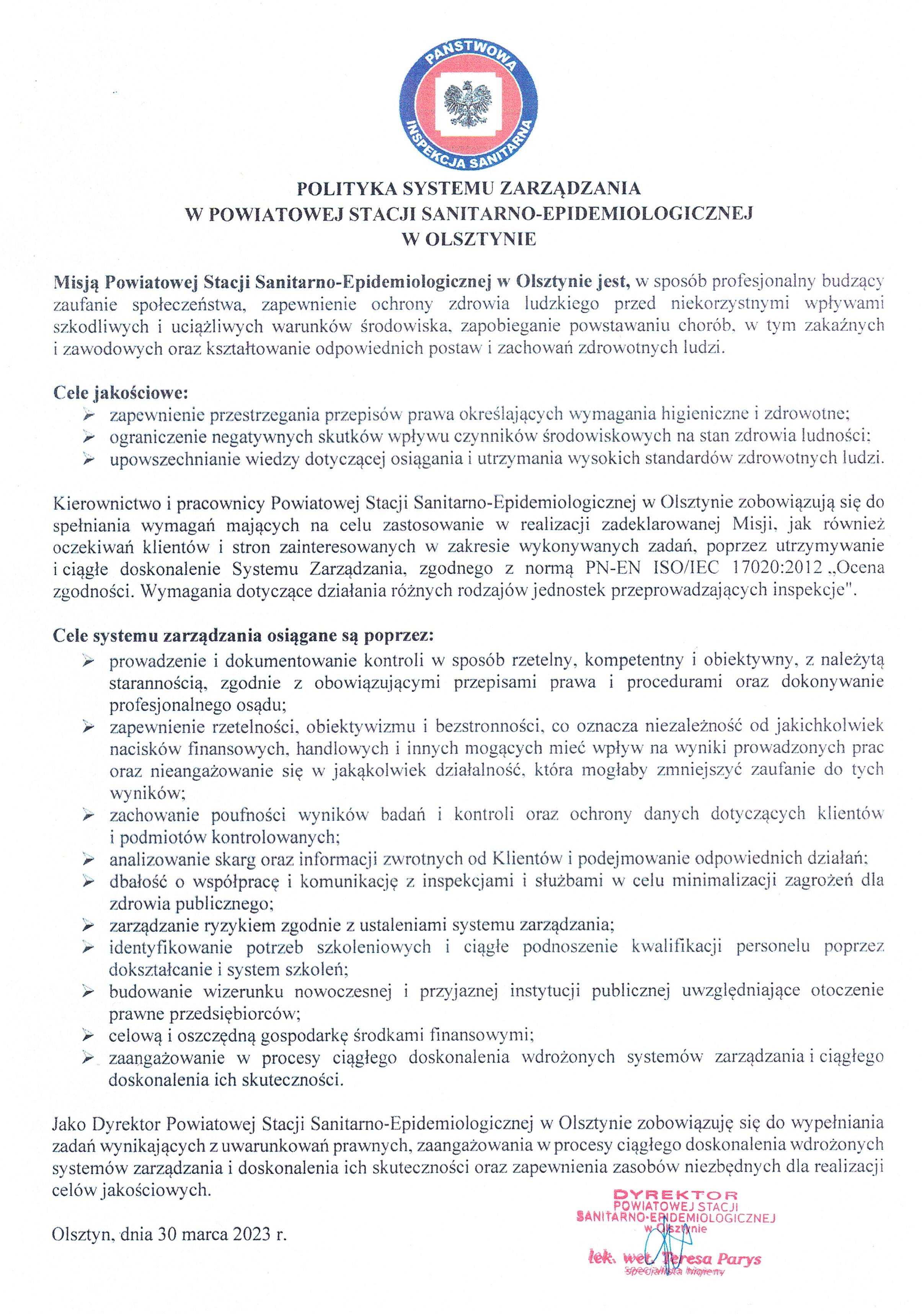 Kierownictwo i pracownicy Powiatowej Stacji Sanitarno-Epidemiologicznej w Olsztynie zobowiązują się do spełniania wymagań mających zastosowanie w realizacji zadeklarowanej Misji, jak również oczekiwań klientów i stron zainteresowanych w zakresie wykonywanych zadań, poprzez utrzymywanie i ciągłe doskonalenie Systemu Zarządzania zgodnego z normą normy PN-EN ISO/IEC 17020:2012 „Ocena zgodności. Wymagania dotyczące działania różnych rodzajów jednostek przeprowadzających inspekcje".