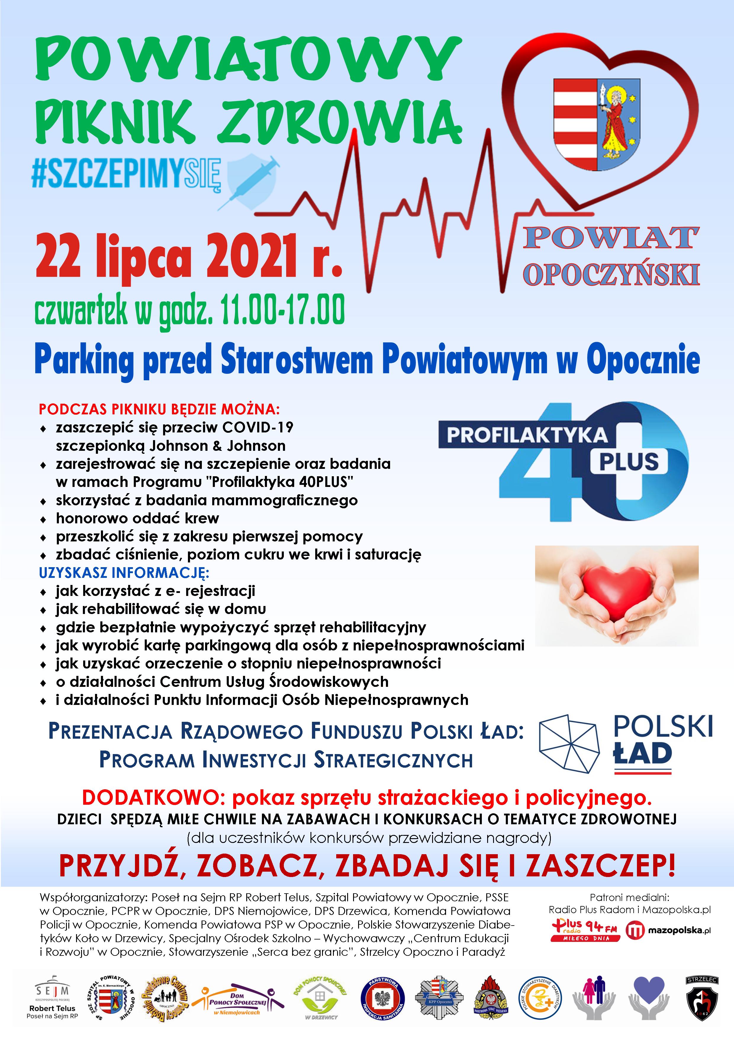 Podczas Powiatowego Pikniku Zdrowia, który odbędzie się 22.07.2021 w godzinach 11:00 – 17:00 na parkingu przy Starostwie Powiatowym w Opocznie będzie można: