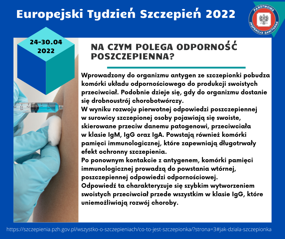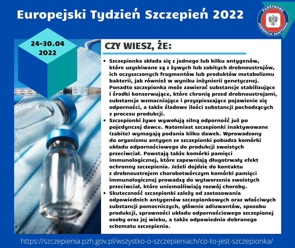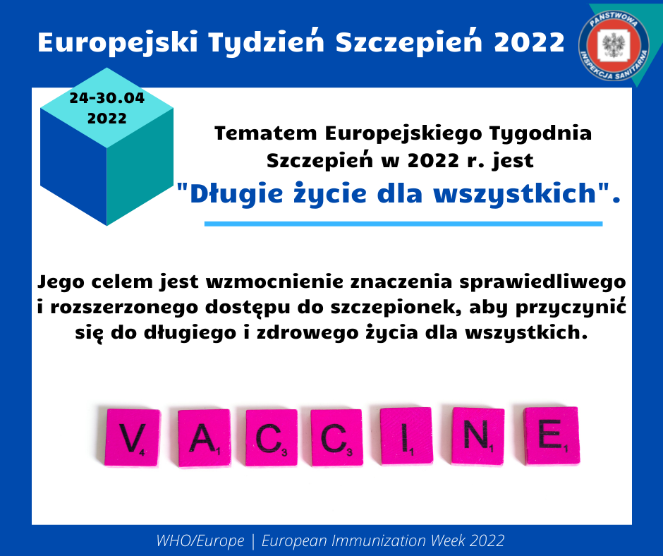 Europejski Tydzień Szczepień 2022 pod hasłem "Długie życie dla wszystkich" przypada w dniach 24–30 kwietnia. Jego celem jest wzmocnienie znaczenia sprawiedliwego i rozszerzonego dostępu do szczepionek, aby przyczynić się do długiego i zdrowego życia dla wszystkich.