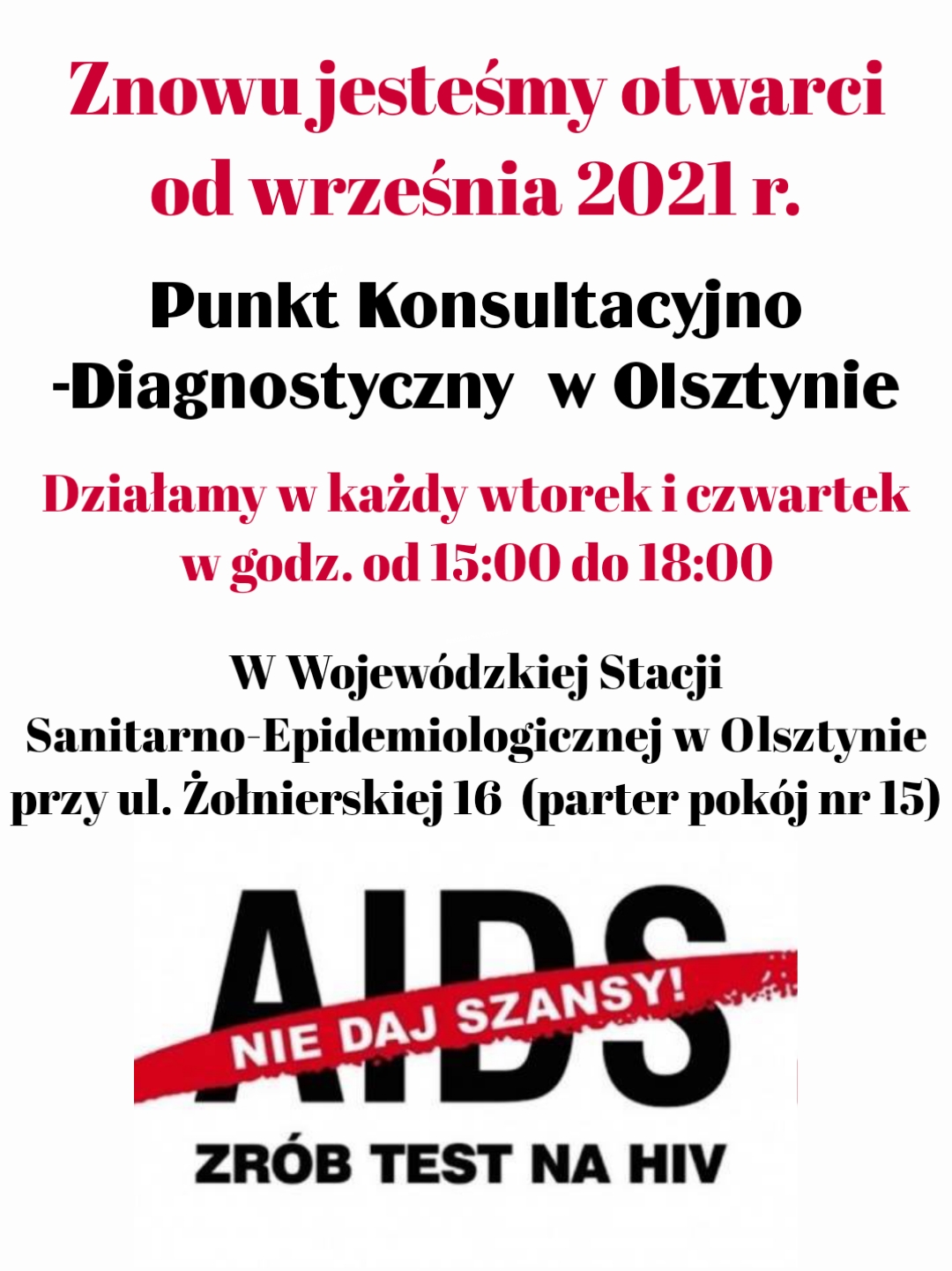 Powiatowa Stacja Sanitarno-Epidemiologiczna w Ostródzie informuje o ponownym uruchomieniu Punktu Konsultacyjno-Diagnostycznego w kierunku HIV w Olsztynie.