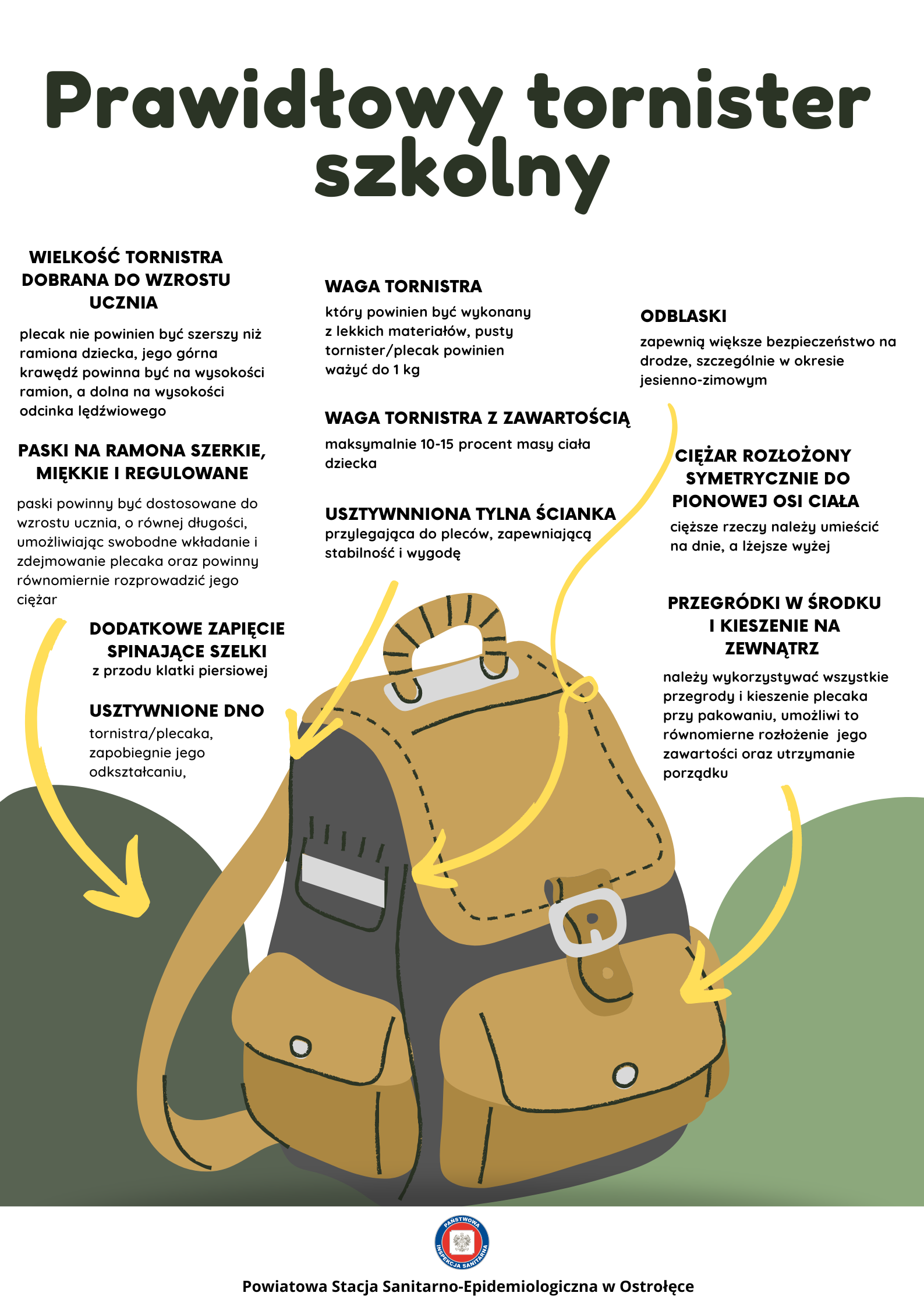WIELKOŚĆ PLECAKA DOBRANĄ DO WZROSTU UCZNIA plecak nie powinien być szerszy niż ramiona dziecka, jego górna krawędź powinna być na wysokości ramion a dolna na wysokości odcinka lędźwiowego.