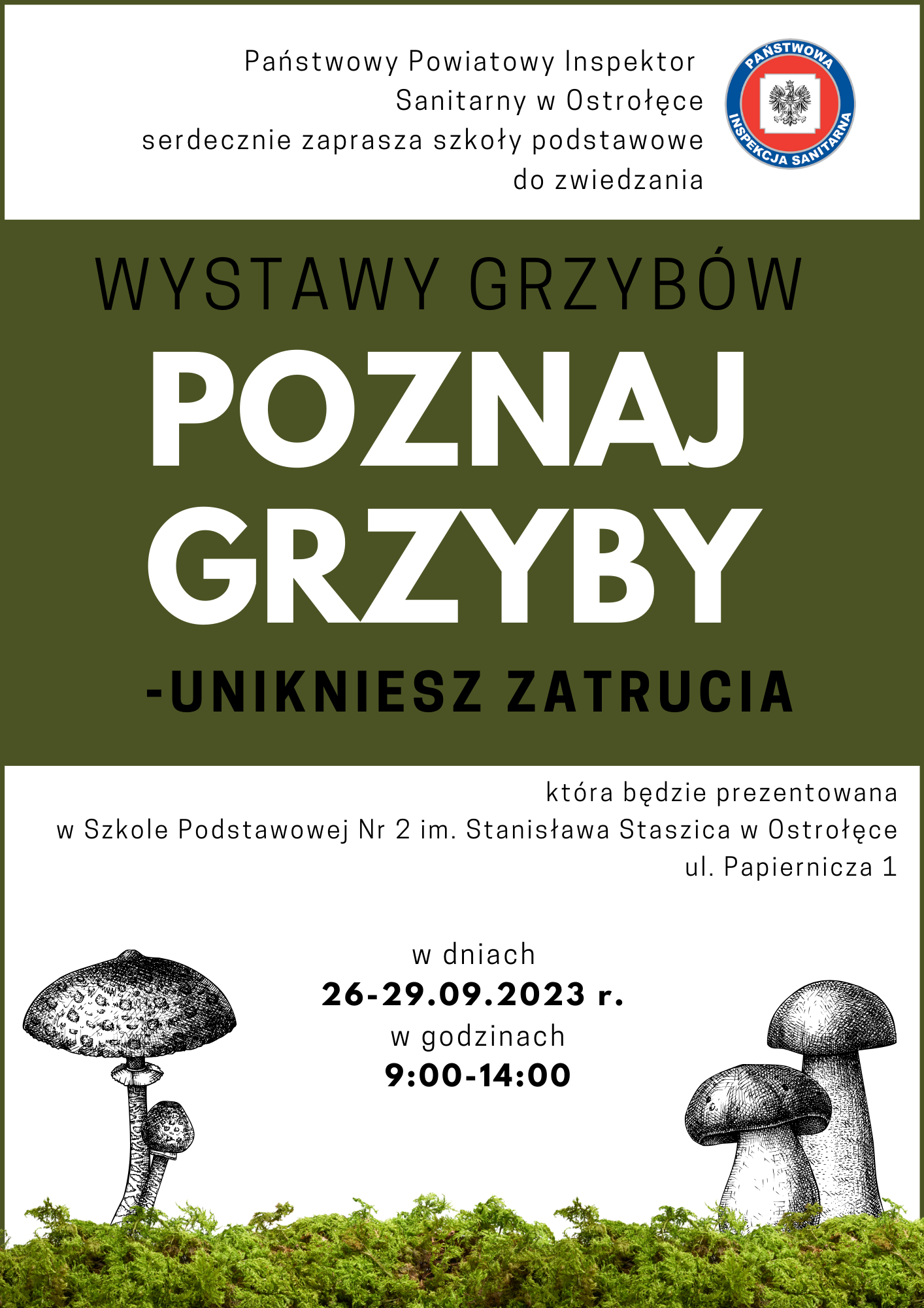 Państwowy Powiatowy Inspektor Sanitarny w Ostrołęce zaprasza do zwiedzania Wystawy Grzybów „Poznaj Grzyby – Unikniesz Zatrucia” organizowanej dla szkół podstawowych w dniach 26-29 września 2023 roku w Szkole Podstawowej Nr 2 im. Stanisława Staszica w Ostrołęce.