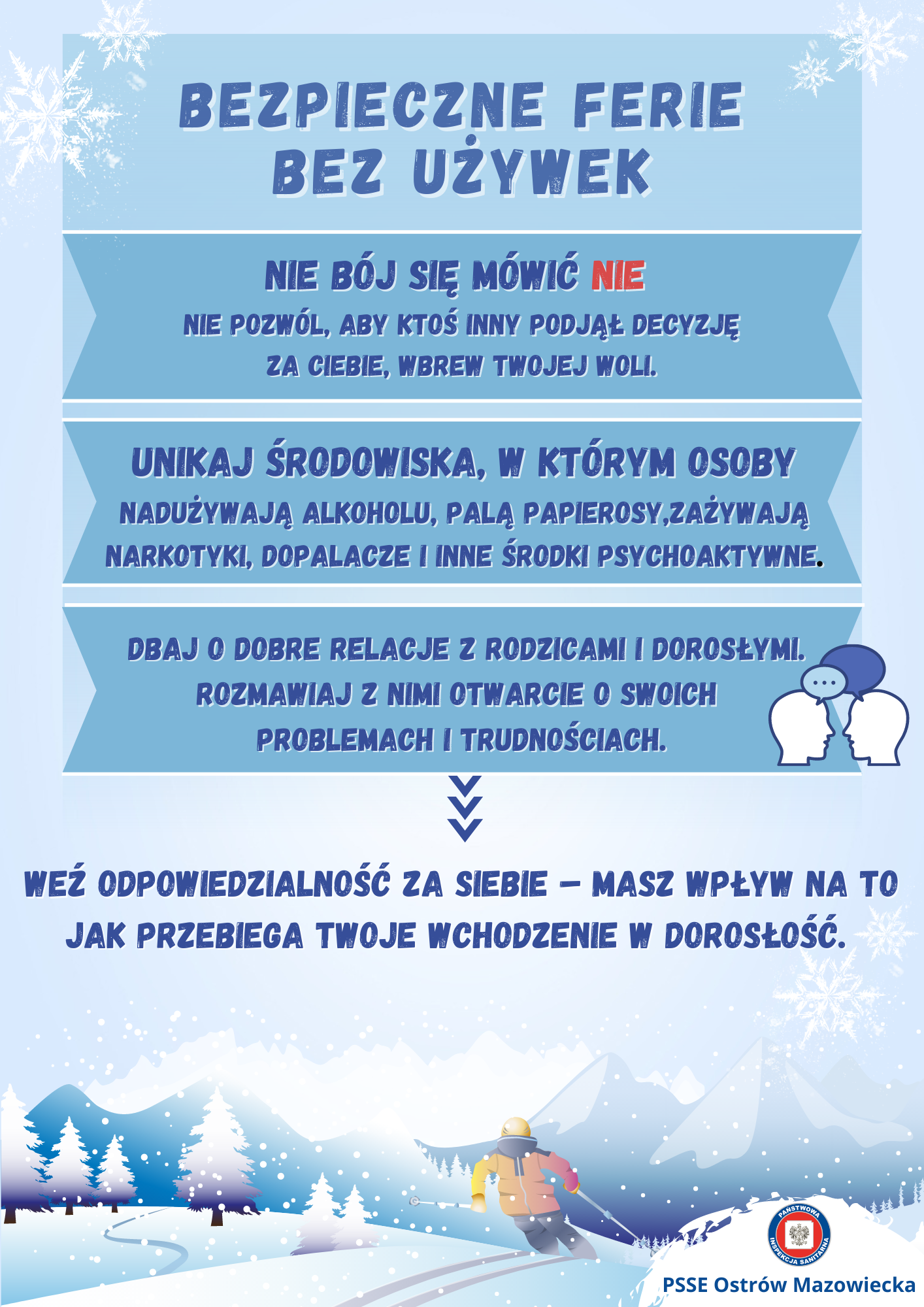 Nareszcie długo wyczekiwane ferie. To czas na odpoczynek, zabawę i rozwój swoich zainteresowań, na które w okresie nauki wszystkim brak czasu. Prosimy nie zapominać, że czas wolny od nauki nie jest okresem wolnym od dbania o własne zdrowie. Mamy nadzieję, że zasady o których wam przypomnimy będą doskonałym kierunkowskazem gwarantującym bezpieczne spędzenie ferii zimowych.