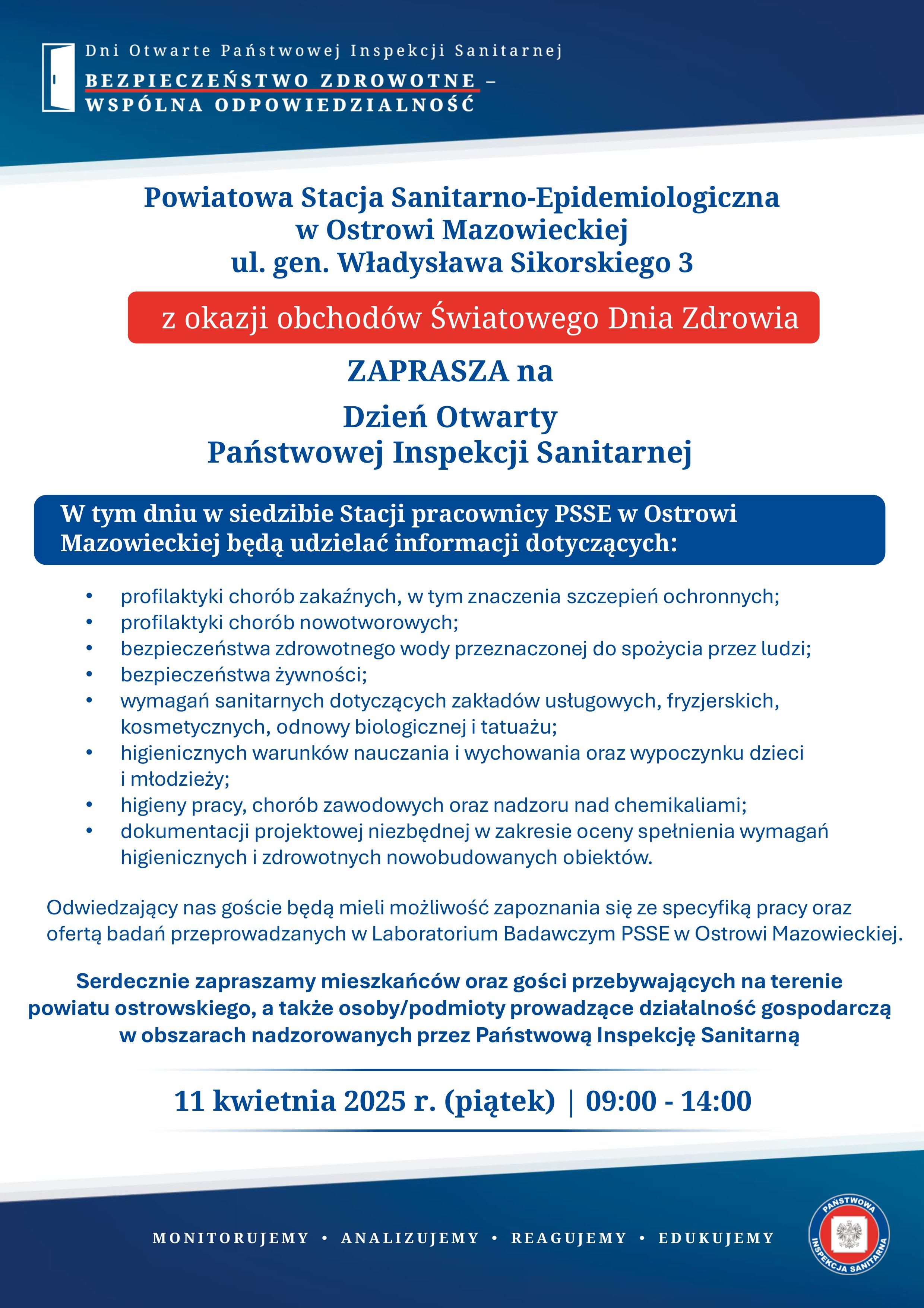 w dniu 11 kwietnia 2025 r. w godz. 9:00-14:00 do siedziby Stacji przy ul. gen. Władysława Sikorskiego na Dzień Otwarty Państwowej Inspekcji Sanitarnej.