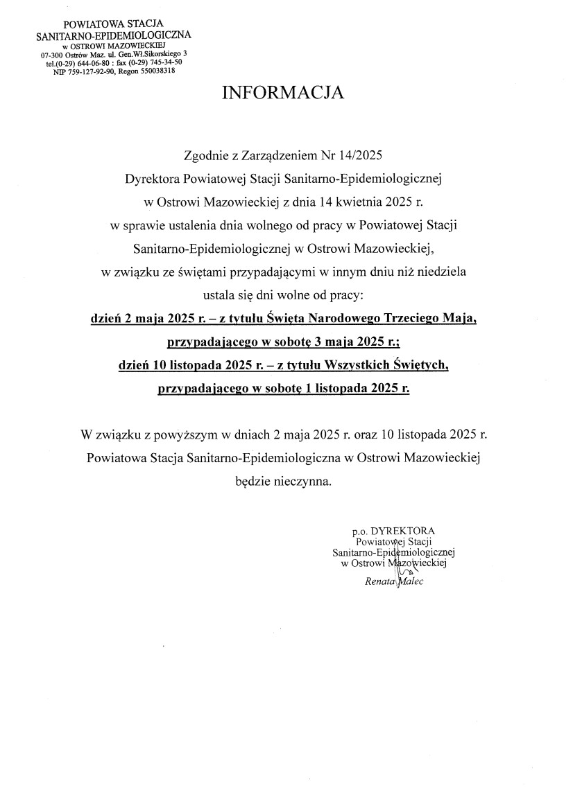| Informacja dot. dni wolnych od pracy w związku ze świętami przypadającymi w innym dniu niż niedziela | 2.0 | 14.04.2025 13:37 zbigniew.kalata |
