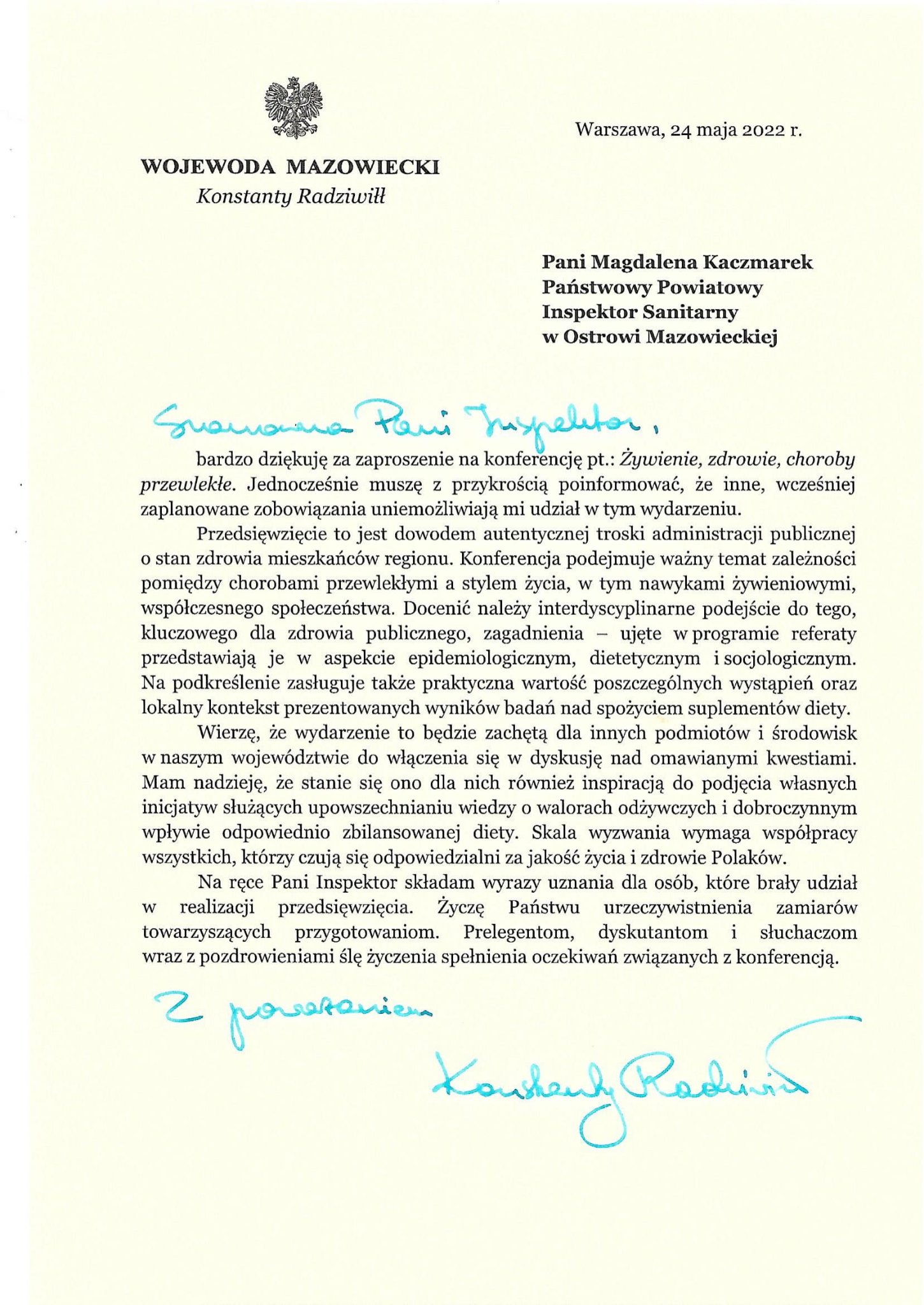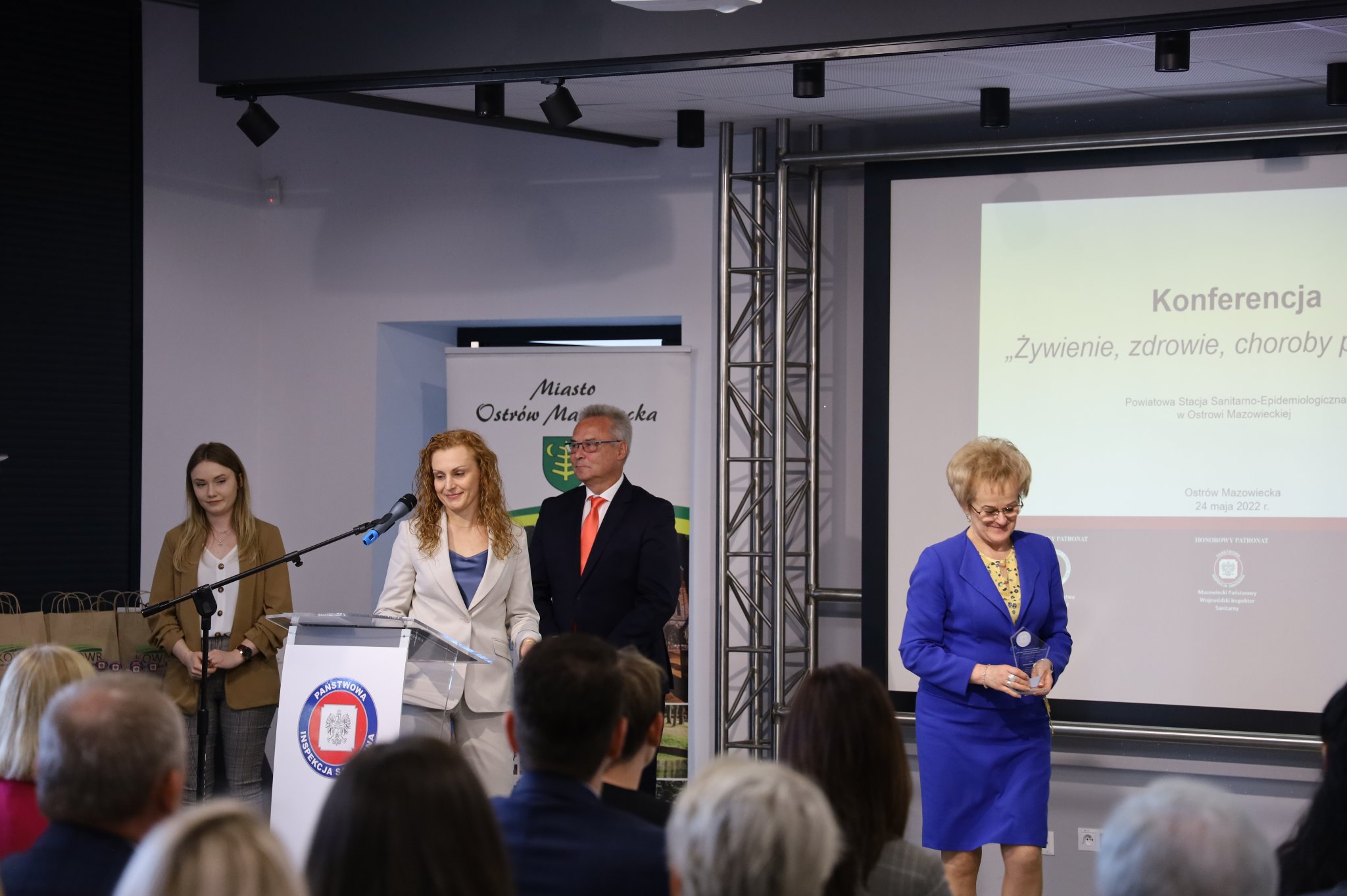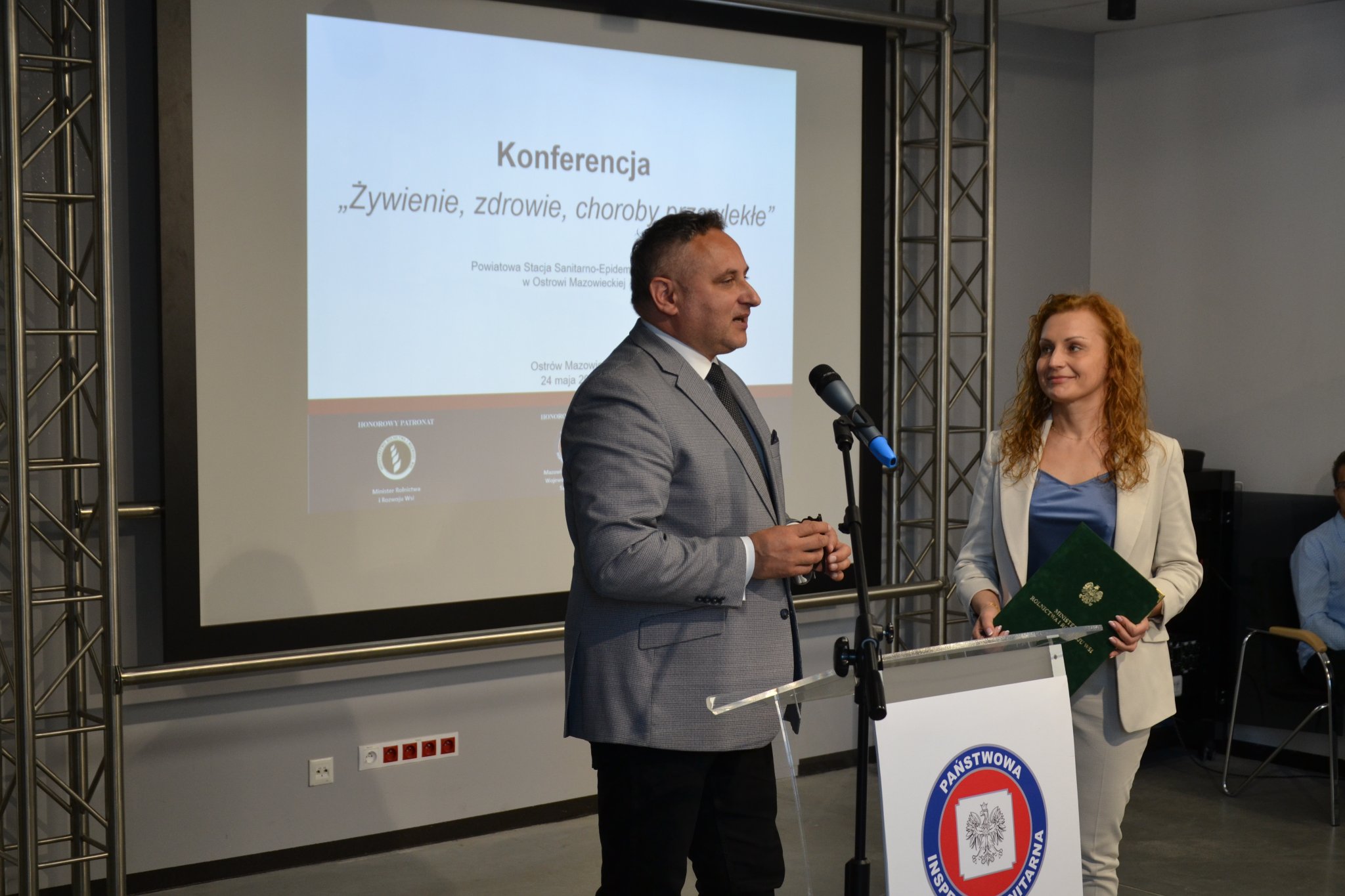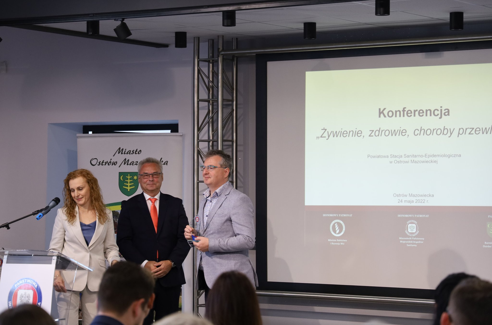 Odżywianie jest jednym z istotnych czynników determinujących stan zdrowia społeczeństwa. Prawidłowe żywienie, bezpieczeństwo żywności, kształtowanie właściwych postaw zdrowotnych, to obecnie aktualne tematy podejmowane przez ekspertów zdrowia publicznego na całym świecie. Mając to na uwadze 24 maja 2022 r. Państwowy Powiatowy Inspektor Sanitarny w Ostrowi Mazowieckiej Pani Magdalena Kaczmarek zorganizowała konferencję pt. "Żywienie, zdrowie, choroby przewlekłe". Patronat honorowy nad tym wydarzeniem objął Wiceprezes Rady Ministrów, Minister Rolnictwa i Rozwoju Wsi Pan Henryk Kowalczyk oraz Mazowiecki Państwowy Wojewódzki Inspektor Sanitarny