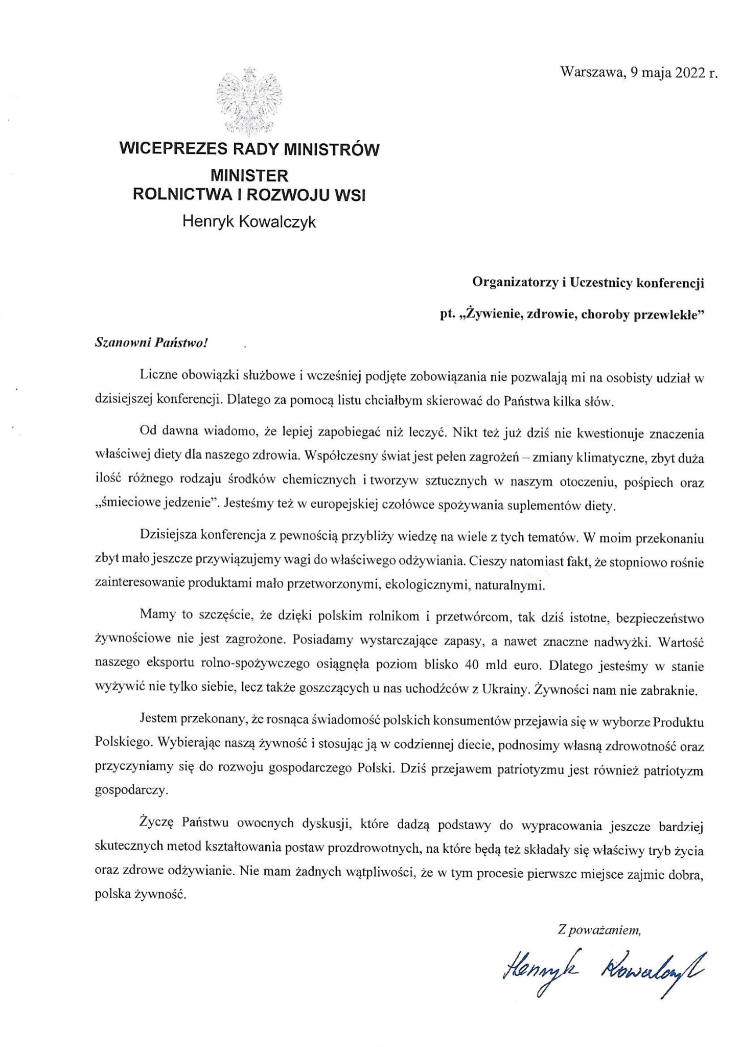 W imieniu Wiceprezesa Rady Ministrów, Ministra Rolnictwa i Rozwoju Wsi Pana Henryka Kowalczyka głos zabrał Pan Krzysztof Niemczuk - Dyrektor Państwowego Instytutu Weterynaryjnego – Państwowego Instytutu Badawczego w Puławach. Odczytał list skierowany do Pani Inspektor Magdaleny Kaczmarek oraz uczestników konferencji. Pan Minister życzył owocnych dyskusji oraz wypracowania jeszcze bardziej skutecznych metod kształtowania postaw prozdrowotnych.