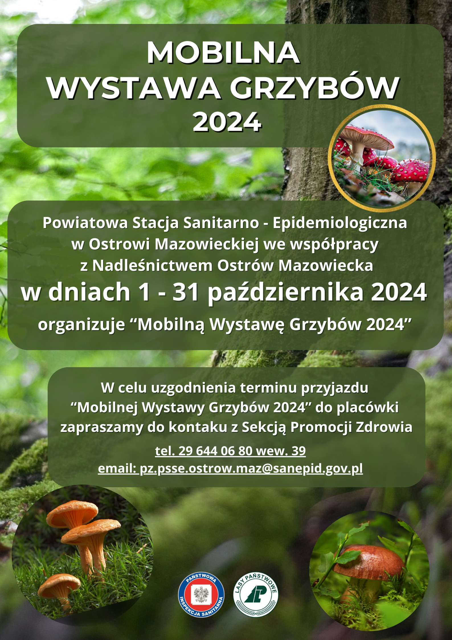 W trosce o zdrowie i bezpieczeństwo mieszkańców powiatu ostrowskiego w szczególności dzieci i młodzieży Powiatowa Stacja Sanitarno - Epidemiologiczna w Ostrowi Mazowieckiej w dniach 1 – 31 października 2024 r. organizuje „Mobilną Wystawę Grzybów 2024”.