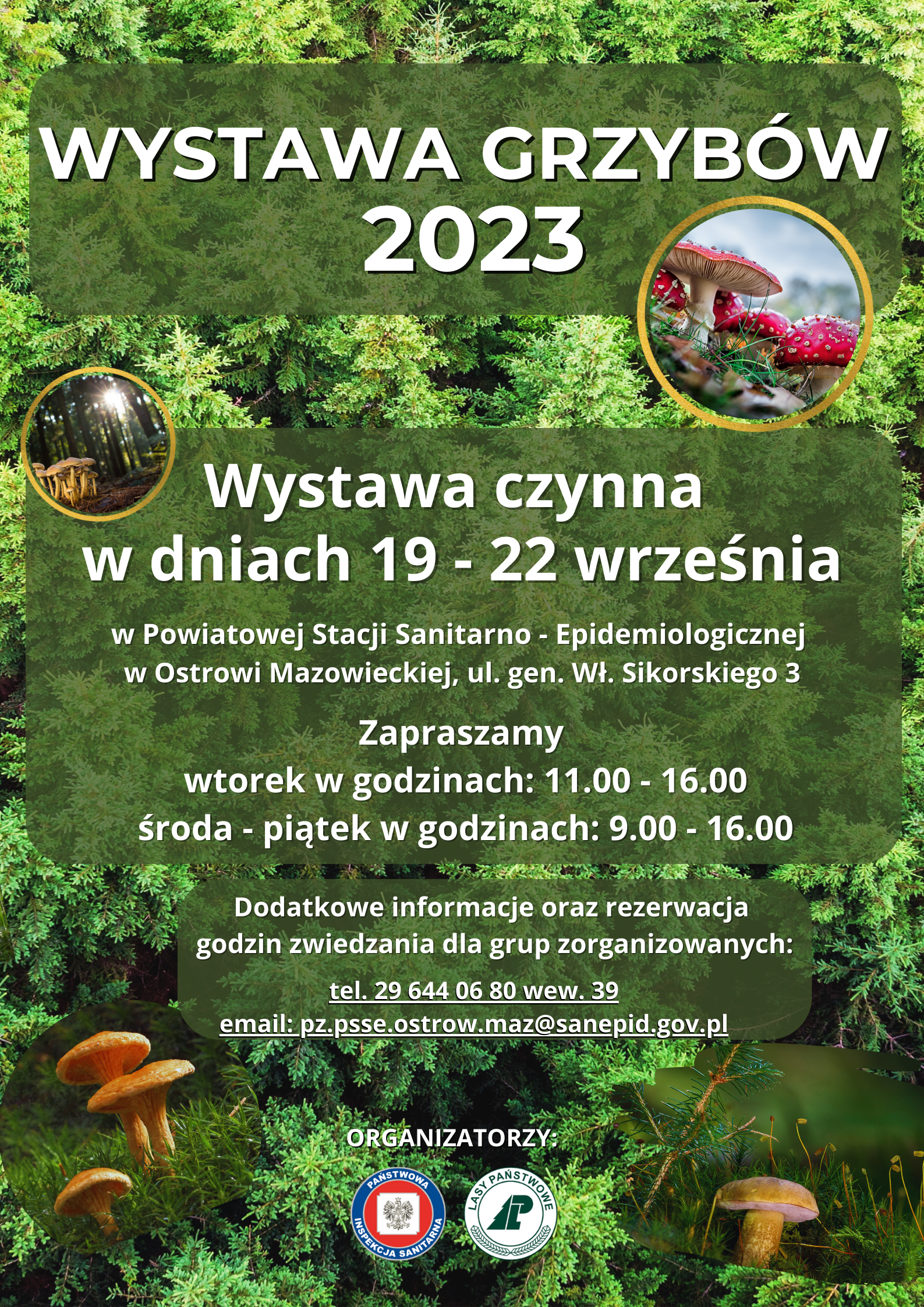 Powiatowa Stacja Sanitarno – Epidemiologiczna w Ostrowi Mazowieckiej wraz z Nadleśnictwem Ostrów Mazowiecka serdecznie zapraszają wszystkich mieszkańców oraz placówki oświatowo – wychowawcze z terenu powiatu ostrowskiego do zwiedzania „Wystawy Grzybów 2023”.