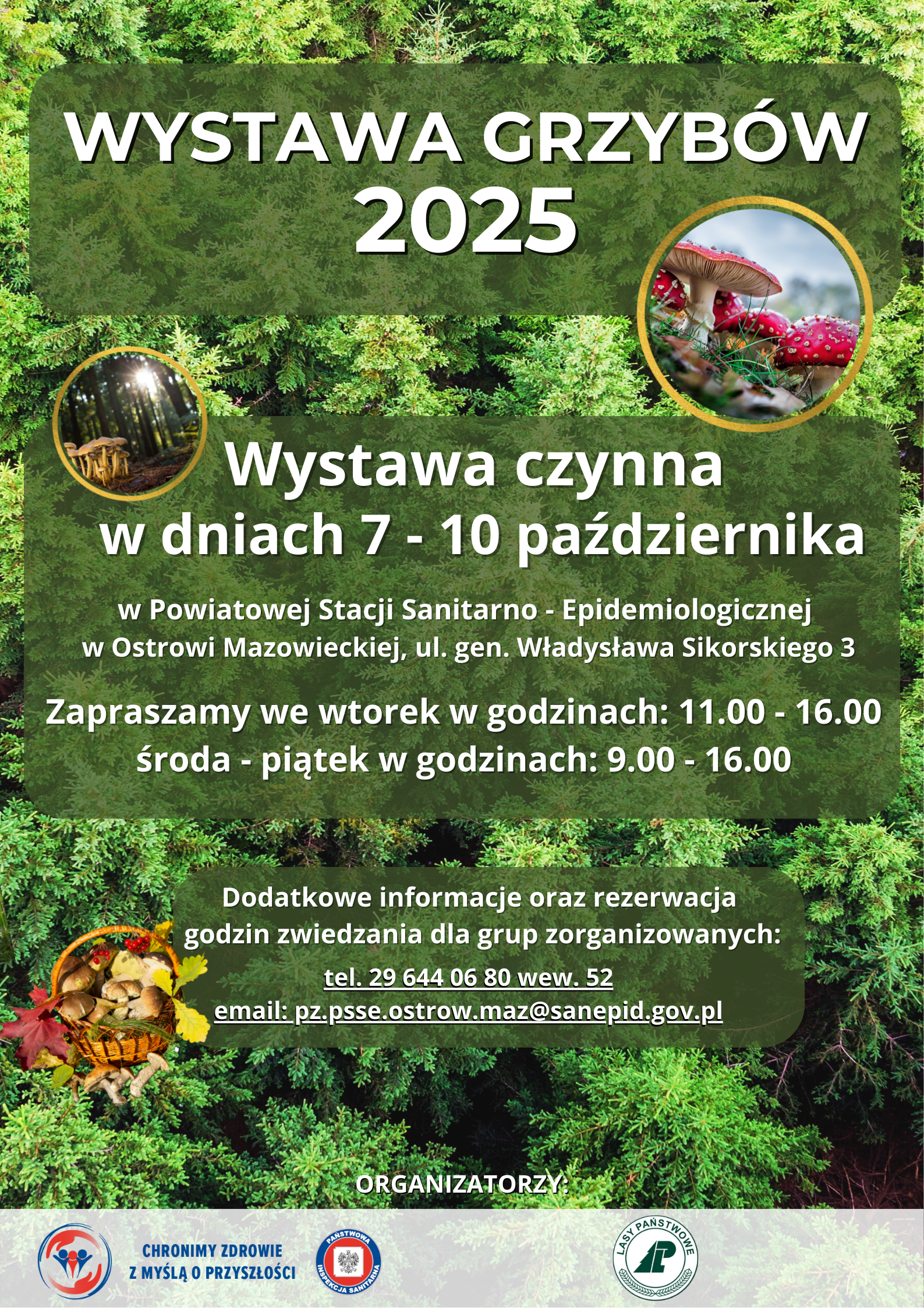 Powiatowa Stacja Sanitarno – Epidemiologiczna w Ostrowi Mazowieckiej wraz z Nadleśnictwem Ostrów Mazowiecka serdecznie zapraszają wszystkich mieszkańców oraz placówki oświatowo – wychowawcze z terenu powiatu ostrowskiego do zwiedzania „Wystawy Grzybów 2025”.