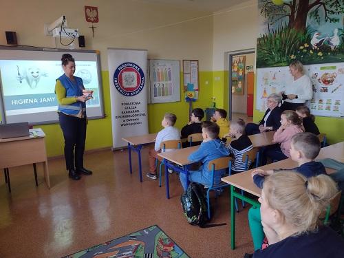 W ramach akcji pracownicy przeprowadzili lekcje dla dzieci klas 1-3 na temat higieny jamy ustnej i higieny mycia rąk. Dzieci chętnie uczestniczyły w instruktażu mycia rąk a na zakończenie zajęć dostały do uzupełnienia zębowe kolorowanki oraz ,,linijki’’ odblaski. Dla klas 4-8 przygotowano prezentację na temat zdrowego stylu życia. Rozmawiano że podstawą zdrowego stylu życia jest aktywność fizyczna i urozmaicona, prawidłowo zbilansowana dieta oraz sen w ich młodym wieku. Na drugiej części lekcji omówiono zagrożenia związane z kleszczami. Uczniowie obejrzeli filmiki edukacyjne nt. prawidłowego i bezpiecznego usuwania kleszczy. Na koniec przekazano wszystkim uczniom ulotkę ,,Mały kleszcz-duży problem”.