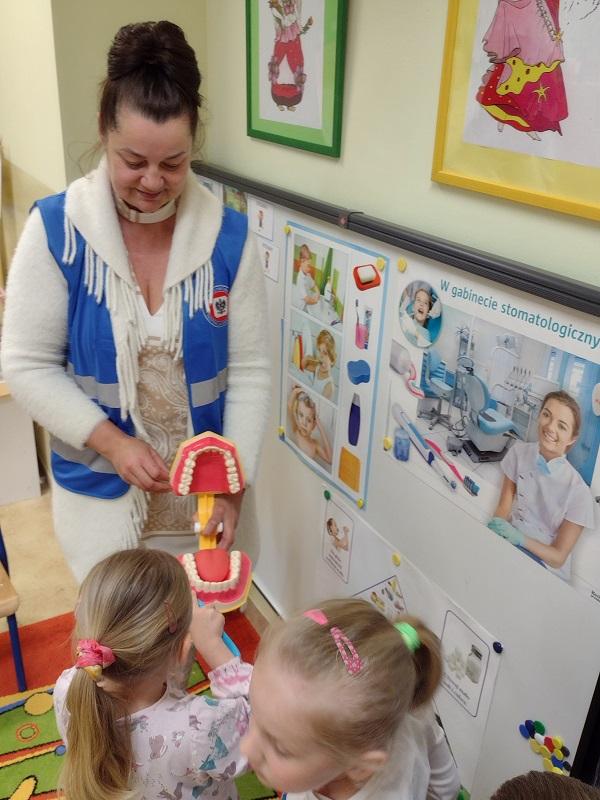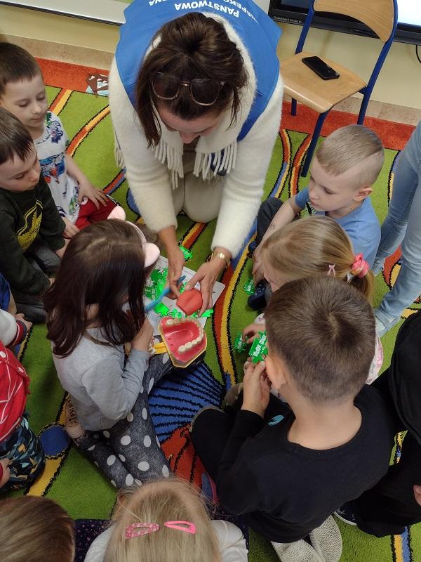 Dzieci dowiedziały się o konieczności codziennej, systematycznej dbałości o zdrowie zębów, dziąseł oraz języka, poznały prawidłową technikę mycia zębów połączonej z instruktażem prawidłowego mycia zębów na modelu sztucznej szczęki.