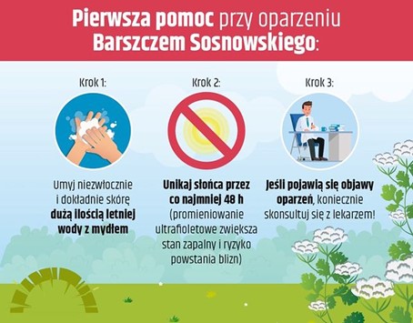 - przebywając w pobliżu barszczu Sosnowskiego chroń skórę i drogi oddechowe przed promieniowaniem UV, pamiętaj, że skóra dzieci jest bardziej wrażliwa na toksyczne działanie soku barszczu,