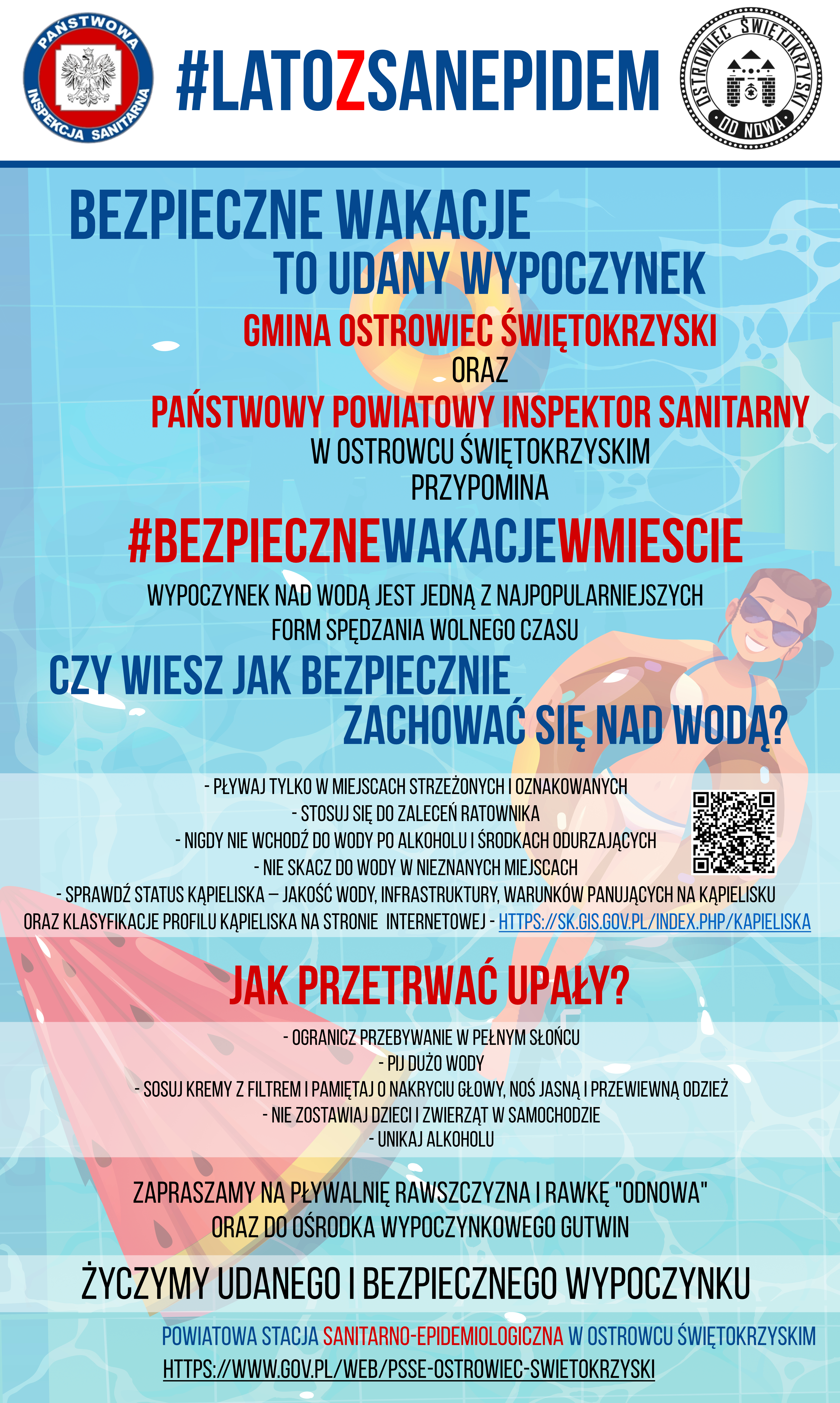 Trwa sezon letni, czas wakacji, pięknych słonecznych dni z wysokimi temperaturami powietrza, które mogą mieć niekorzystny wpływ na zdrowie ludzi, a w szczególności dla osób starszych i dzieci, bowiem mogą skończyć się odwodnieniem organizmu.