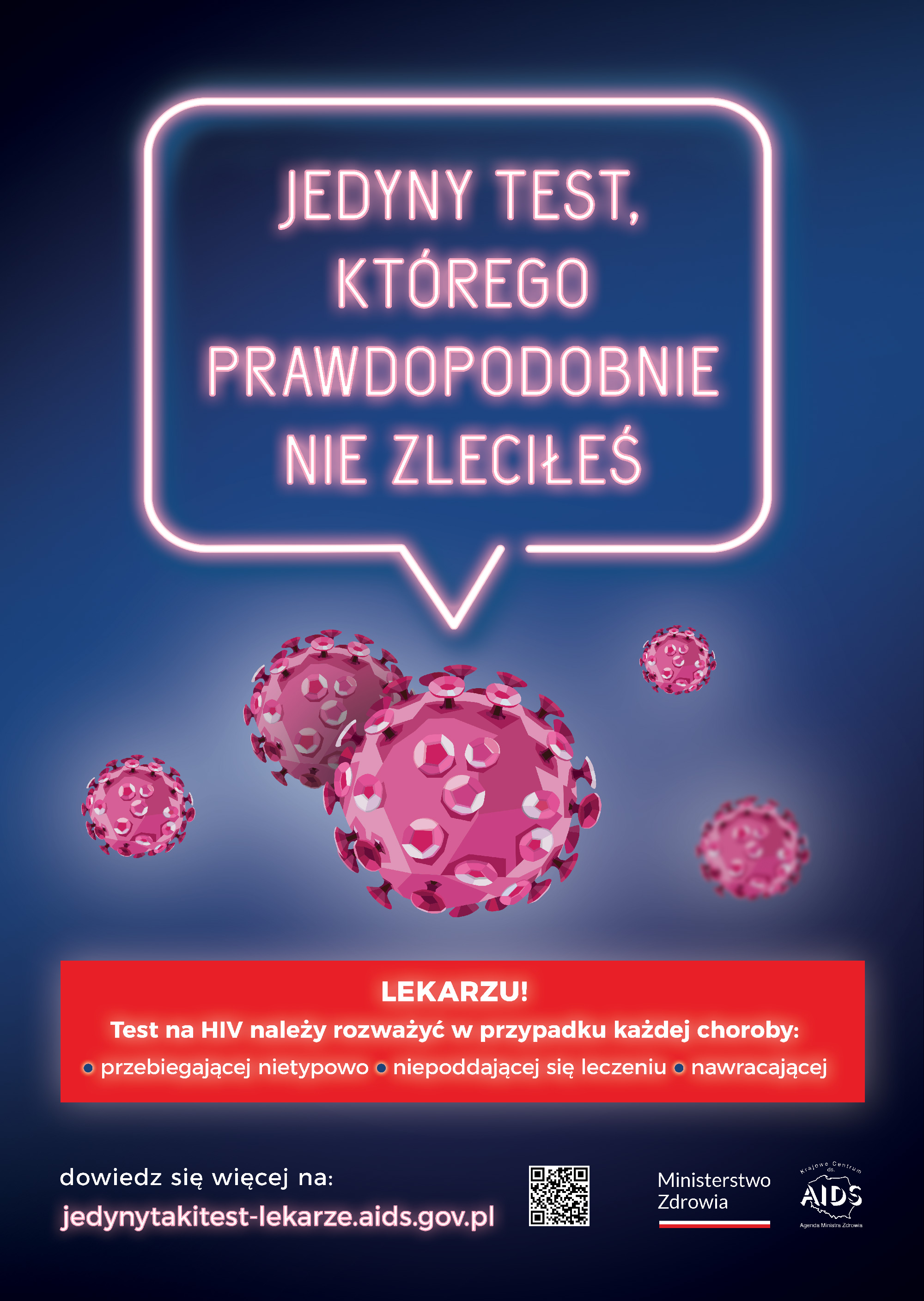 W roku 2023 przekaz kampanii pod hasłem: „Jedyny test, którego prawdopodobnie nie zleciłeś”: https://jedynytakitest-lekarze.aids.gov.pl/, został skierowany do środowiska medycznego, zwłaszcza do lekarzy podstawowej opieki zdrowotnej, a także do lekarzy ginekologów, pediatrów/neonatologów, lekarzy chorób wewnętrznych i zakaźnych oraz studentów medycyny, a poprzez te grupy zawodowe – do ogółu społeczeństwa. Skierowanie pacjenta na wykonanie testu w kierunku HIV powinno być standardowo inicjowane przez lekarzy w przypadku każdej choroby przebiegającej nietypowo, niepoddającej się leczeniu lub nawracającej, a także w wielu sytuacjach klinicznych wynikających ze specyfiki danej specjalizacji.