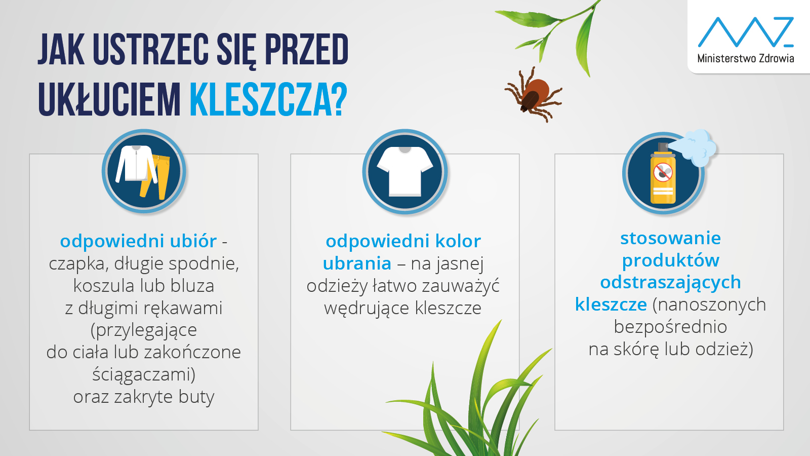 Kleszcze są aktywne już od przełomu lutego i marca. Można spotkać je także jesienią. Są nosicielami patogenów – wirusów lub bakterii, które wywołują choroby odkleszczowe. Ugryzienie nie jest bolesne ani groźne. Nie każdy kleszcz jest zarażony. Jednak trzeba zachować ostrożność i w razie choroby podjąć szybko leczenie.