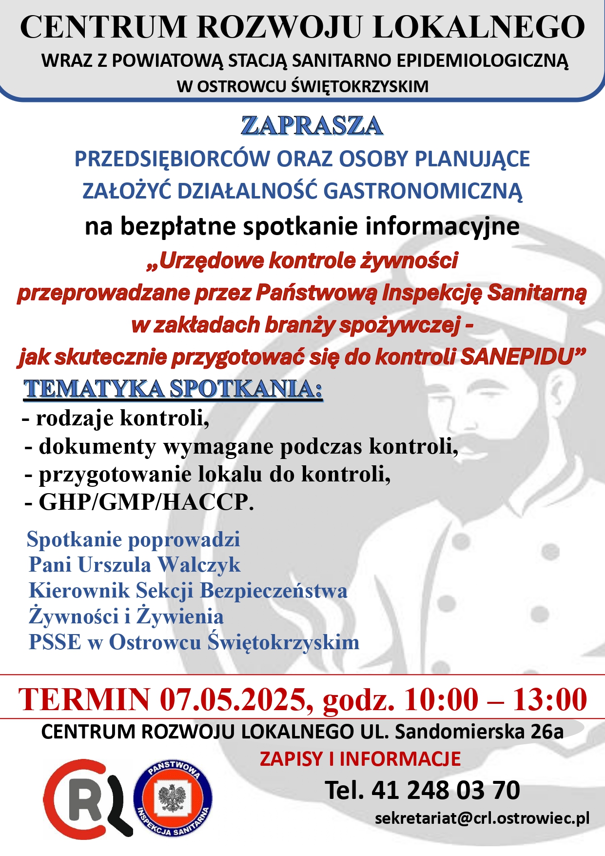 z Centrum Rozwoju Lokalnego zaprasza przedsiębiorców oraz osoby planujące założyć działalność gastronomiczną na bezpłatne spotkanie informacyjne. Podczas spotkania poruszone zostaną następujące tematy: