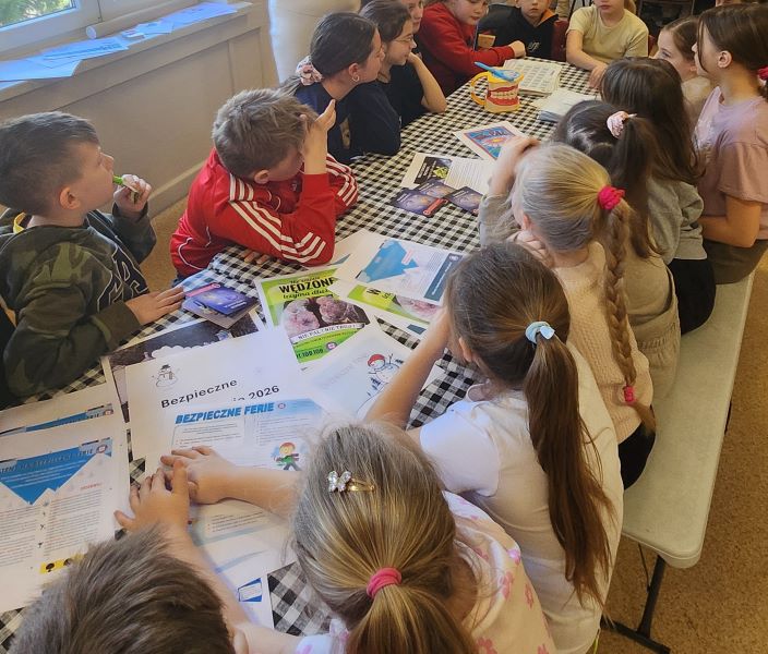 W ramach akcji „Bezpieczne ferie” odbyły się kolejne dwa spotkania z uczestnikami zimowego wypoczynku. Na spotkaniach z dziećmi przeprowadzono działania promujące zdrowy styl życia. Omówiono tematykę dotyczącą zdrowego odżywiania, energetyków, aktywności fizycznej, profilaktyki antynikotynowej, wszawicy. Przypomniano zasady bezpieczeństwa podczas ferii zimowych, mycia rąk, mycia zębów. Udzielono dzieciom instruktażu mycia ząbków na modelu szczęki. Dzieci aktywnie uczestniczyły w zajęciach i dyskutowały. Przekazano uczestnikom gadżety, kolorowanki i materiały edukacyjne.