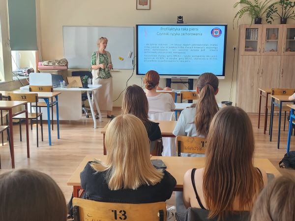 W ramach projektu przeprowadzono wśród młodzieży I Liceum Ogólnokształcącego w Ostrzeszowie zajęcia edukacyjne. Na spotkaniu uczestnicy obejrzeli prezentację, w której przedstawiono czynniki ryzyka, objawy i profilaktykę raka piersi oraz epidemiologię występowania nowotworów w Polsce. Następnie odbył się pokaz nauki samobadania piersi z wykorzystaniem fantomu. Zachęcano młode kobiety do regularnego samobadania i badań profilaktycznych. Wszyscy uczestnicy szkolenia otrzymali kalendarze badania piersi oraz ulotkę Badaj piersi!