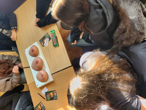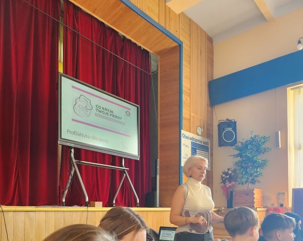 W ramach realizacji projektu edukacyjnego pt. „Co kryją Twoje piesi?” odbyło się szkolenie połączonego z nauką samobadania piersi na fantomie. W szkoleniu uczestniczyli uczniowie klasy I z Zespołu Szkól nr 1 w Ostrzeszowie. W pierwszej części spotkania przedstawiono prezentację i omówiono epidemiologię występowania nowotworów w Polsce, czynniki ryzyka, objawy i profilaktykę raka piersi. W drugiej części szkolenia odbył się pokaz nauki samobadania piersi z użyciem fantomu. Wszyscy uczniowie otrzymali kalendarzyki badania piersi oraz ulotkę Badaj piersi!