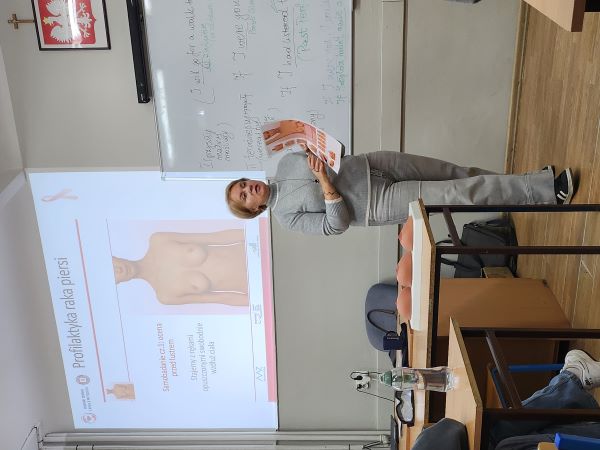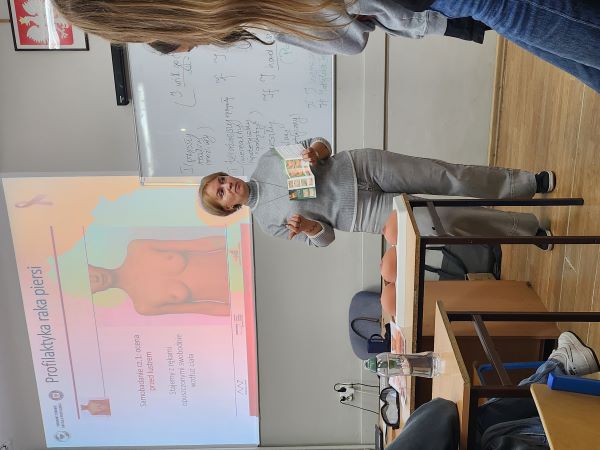 w Ostrzeszowie. W szkoleniu wzięli udział uczniowie z jednej klasy IV . Na spotkaniu uczestnicy obejrzeli prezentację multimedialną, w której przedstawiono czynniki ryzyka, objawy i profilaktykę raka piersi oraz epidemiologię występowania nowotworów w Polsce. Poinformowano młodzież o stronie internetowej Narodowego Portalu Okolicznego, na której można znaleźć rzetelną wiedzę dotyczącą profilaktyki i chorób nowotworowych. Następnie odbył się pokaz nauki samobadania piersi z wykorzystaniem fantomu. Wszyscy uczestnicy szkolenia otrzymali kalendarze badania piersi oraz ulotkę Badaj piersi! Podczas spotkania.